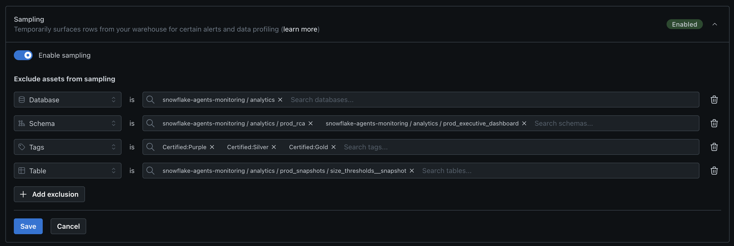 In addition to disabling sampling for an entire integration, you can now disable sampling for specific databases, schemas, tables, or tagged assets — while keeping sampling enabled elsewhere. These controls are fully available in the UI.