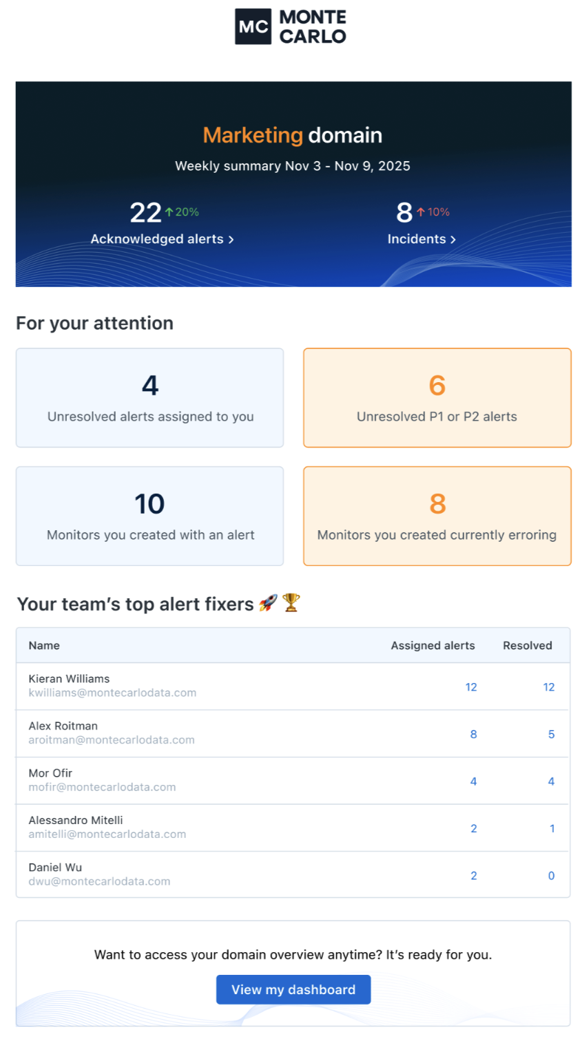 **Take action in one click:**Every stat in the email is clickable and takes you straight to a filtered view in Monte Carlo, so you can review details, investigate issues, or make updates right away.