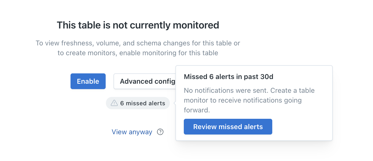 Monte Carlo now surfaces Coverage Gaps across the product to highlight assets that have had recent issues but aren’t covered by monitors.