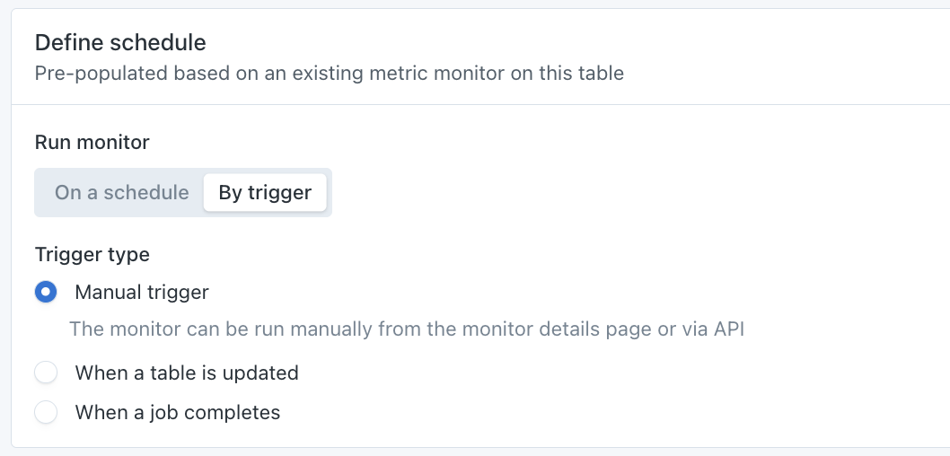 You can now manually trigger metric monitors either from the UI (via the Run button) or through the API. This gives teams flexibility to run monitors exactly when their data pipelines finish loading, avoiding wasted compute from partial runs and ensuring results reflect the latest data.
