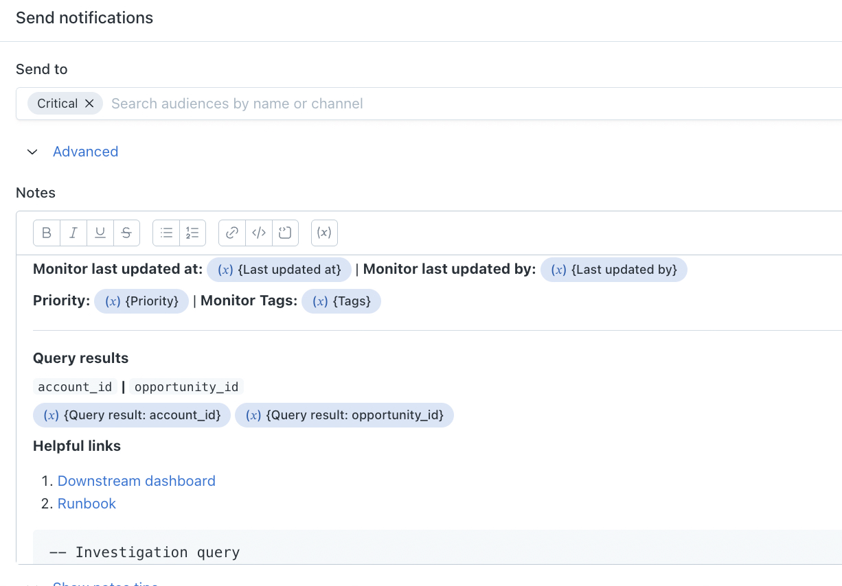 Monitor Notes appear directly in alert notifications and are often the first thing teammates read when triaging an issue.