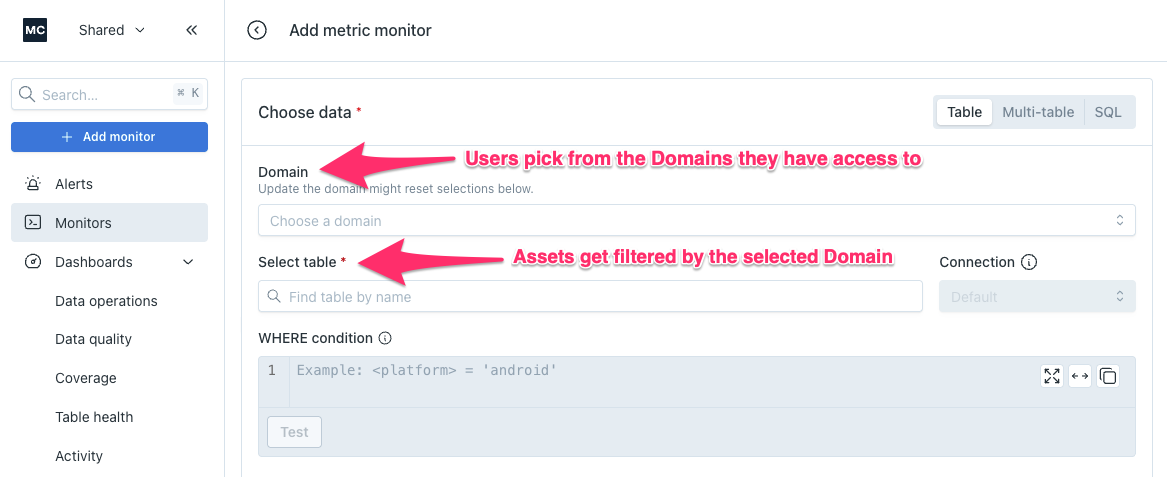 When creating a Monitor, the top of the form will ask the user to select a Domain. The available Domains will be filtered to the ones they have access to. Asset selection for that Monitor will then be filtered by the selected Domain.