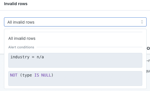 View all of the invalid row samples, or filter them by a specific validation condition.