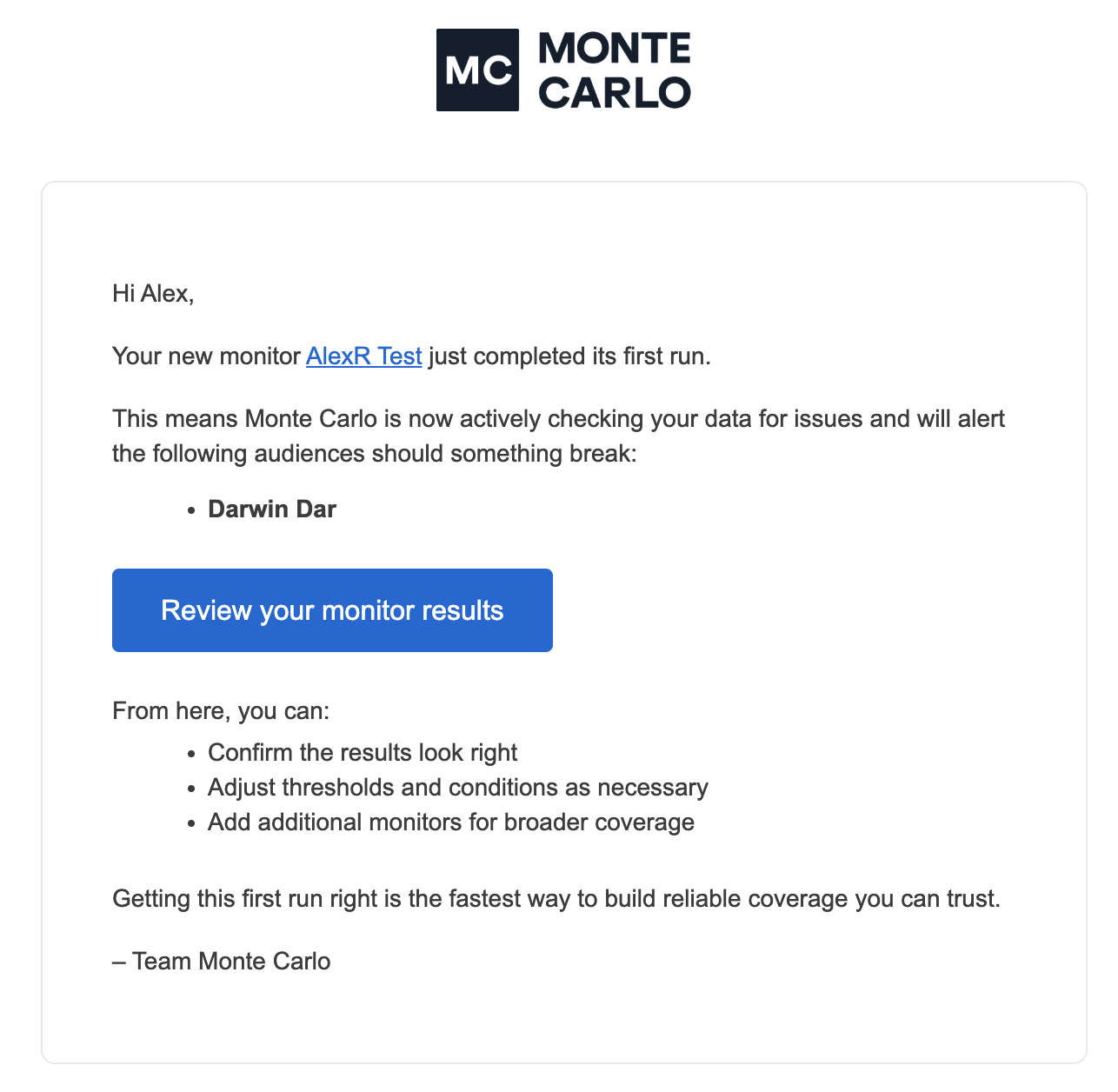 Each email includes a direct link to the monitor details page, where you can: Review the results / Adjust thresholds or settings / Re-run the monitor if needed.