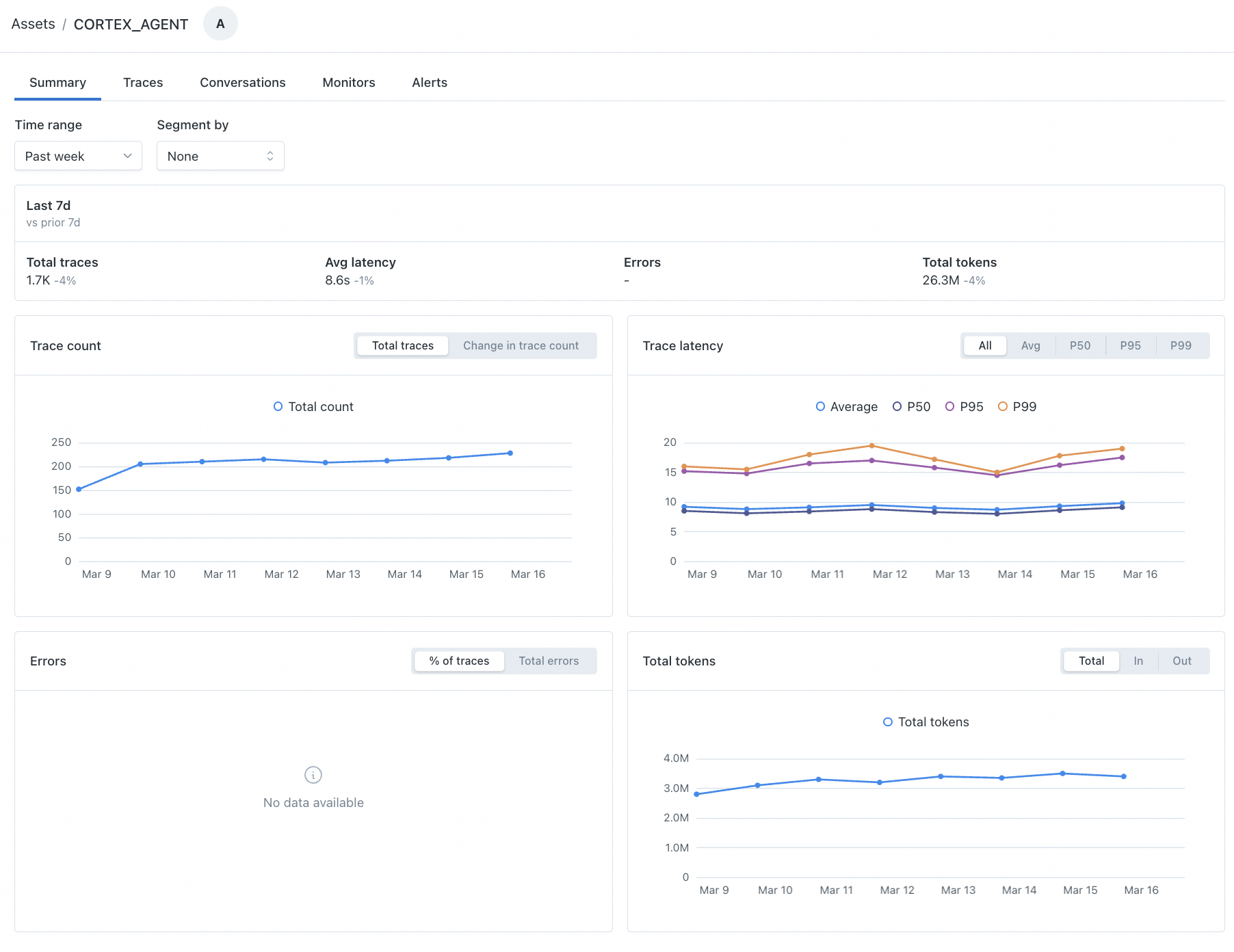 Once connected, Cortex trace and span data flows in automatically, powering the full Agent Observability experience: trace viewer, conversation viewer, trace dashboards, and all four agent monitor types.