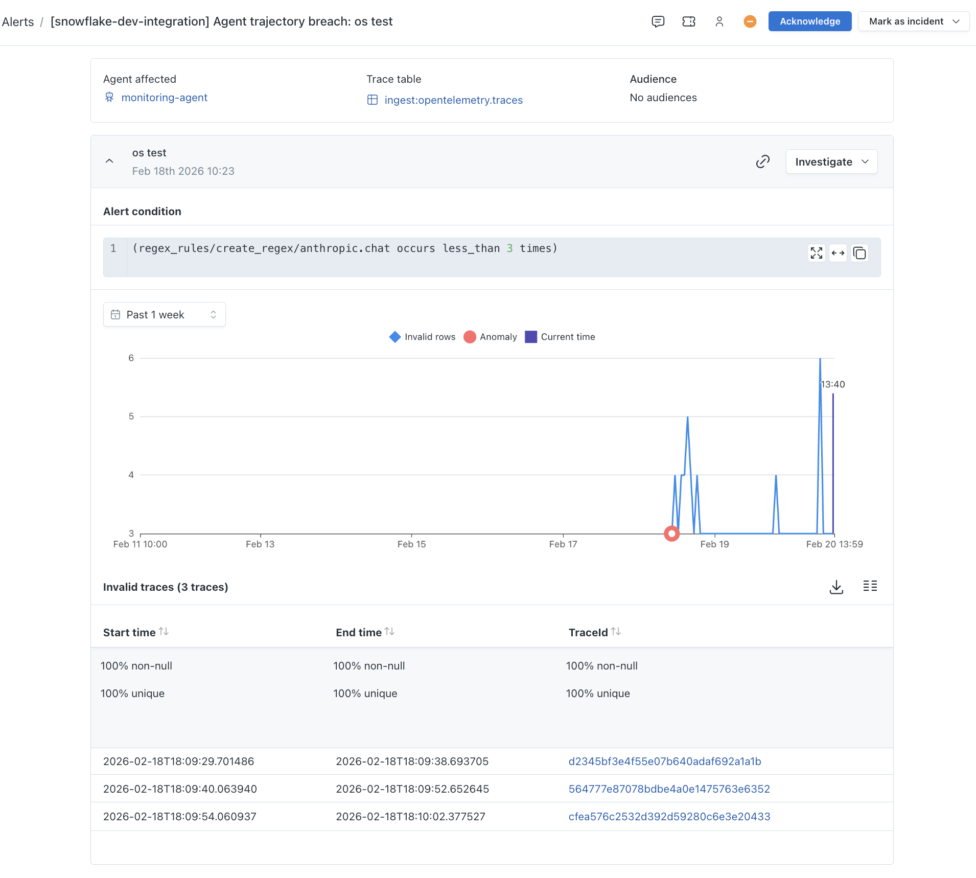 Agent Trajectory Monitors generate an Alert whenever traces breach the defined alert conditions.