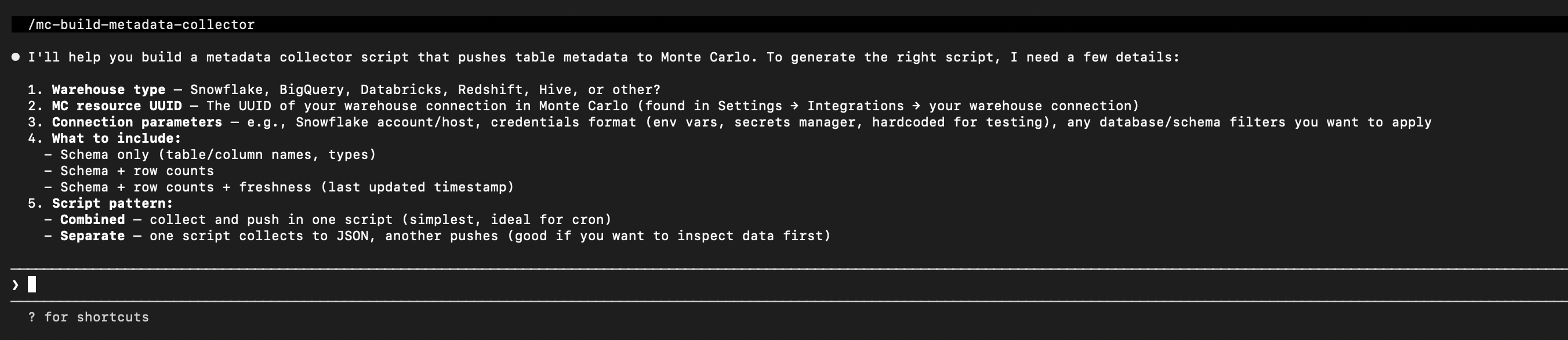 /mc-build-metadata-collector— generate a metadata push script for your warehouse/mc-build-lineage-collector— generate a lineage push script/mc-build-query-log-collector— generate a query log push script/mc-validate-metadata— validate what you've pushedThe skills also explain how to convert a one-off push into a scheduled recurring script.