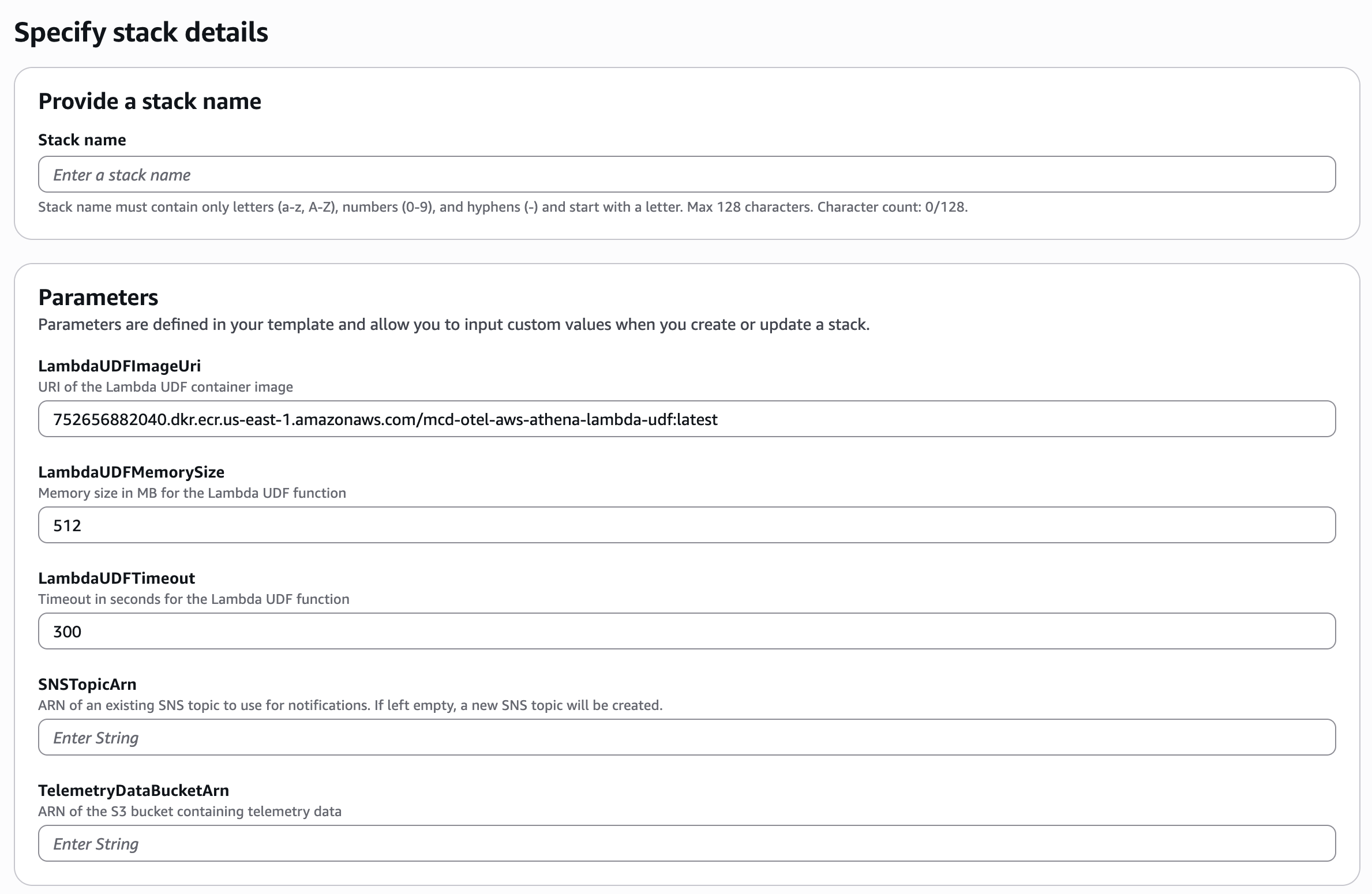 The only required parameters for this deployment is the TelemetryDataBucketArn parameter which is the ARN of a S3 bucket where the OpenTelemetry Collector will be writing your trace data. If you wish to use an existing SNS Topic you can optionally provide the ARN in the SNSTopicArn parameter. Otherwise, a new SNS Topic will be created if this field is left blank.
