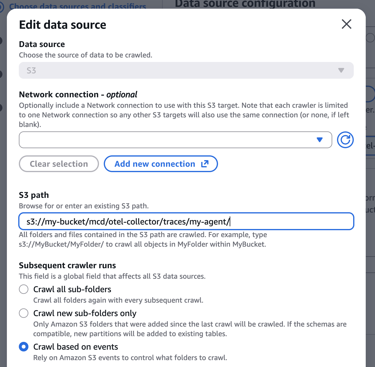 - Save changes to the original Crawler. It will not crawl all directories of your S3 bucket and continue to ingest traces for your remaining agents into the