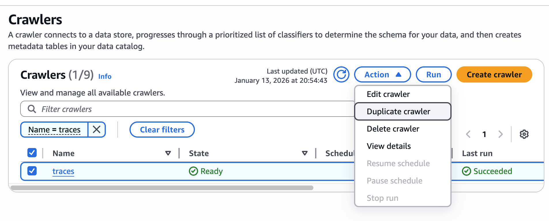 - Start by visiting the AWS Console Glue Crawler page and duplicating the Crawler created by the Monte Carlo Terraform deployment.