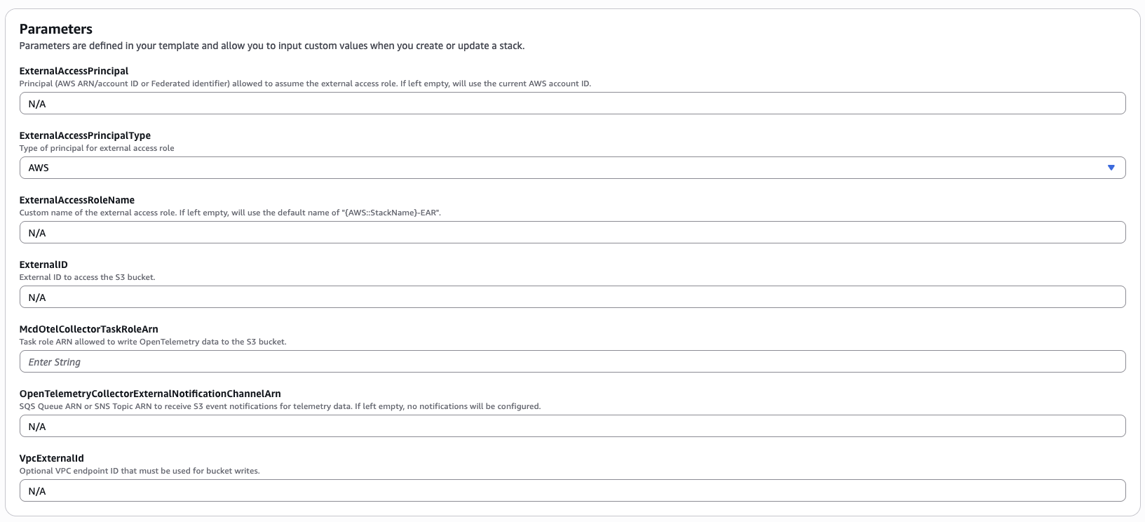 The following parameters can be ignored for now, they will be set in a later step as you configure trace ingestion into your data warehouse:
