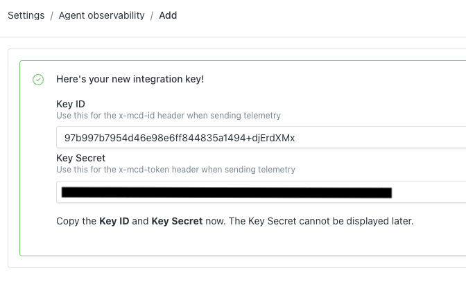 https://integrations.getmontecarlo.com/otel - Use the Key ID and Key Secret from Step #2 to configure the MonteCarlo API credentials. To do this, follow the instructions under "Add MonteCarlo API credentials as environment variables" in the SDK documentation.