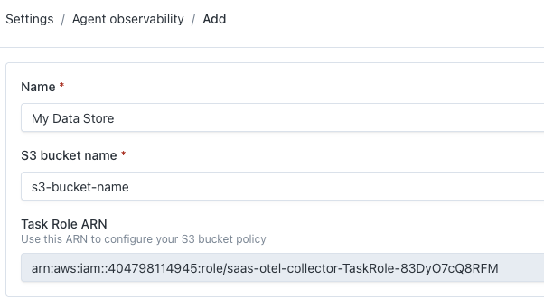 McdOtelCollectorTaskRoleArn - The Monte Carlo-hosted collector requires IAM policy permissions to write telemetry data to your S3 bucket. This parameter is used as the Principal for these permissions. The value needs to be retrieved from the Monte Carlo UI. Login to Monte Carlo and navigate to Settings -> Agent observability. Under "Trace data stores", click "Add" and copy the value of "Task Role ARN". See the screenshot below for reference.