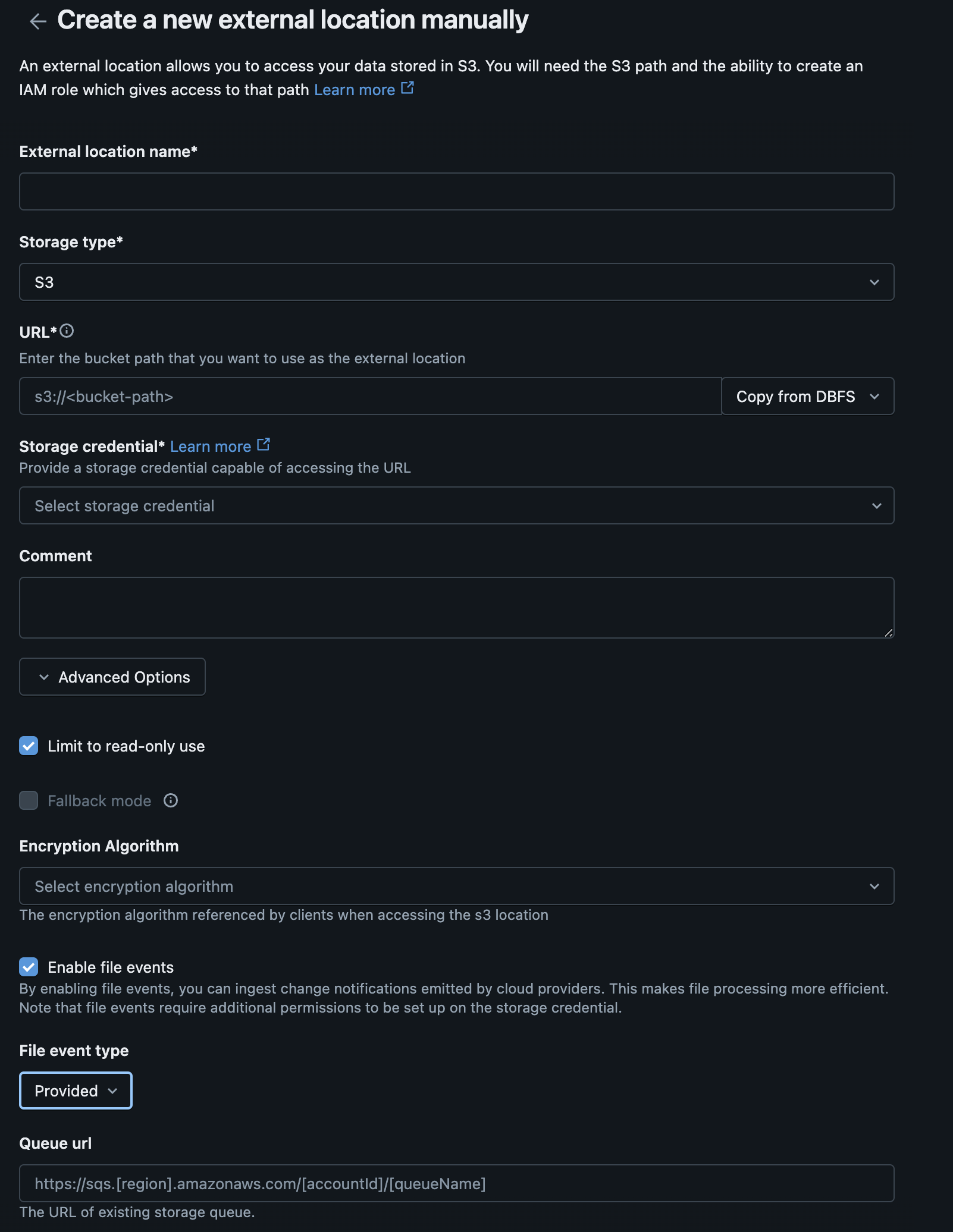 File event type: Choose "Provided"Queue url: Use the relevant output from the MC SQS stack or any existing queue configured to respond to object creation events in the respective S3 bucket. If you do not have a SQS queue yet, you can enable File Events later by editing the External Location.