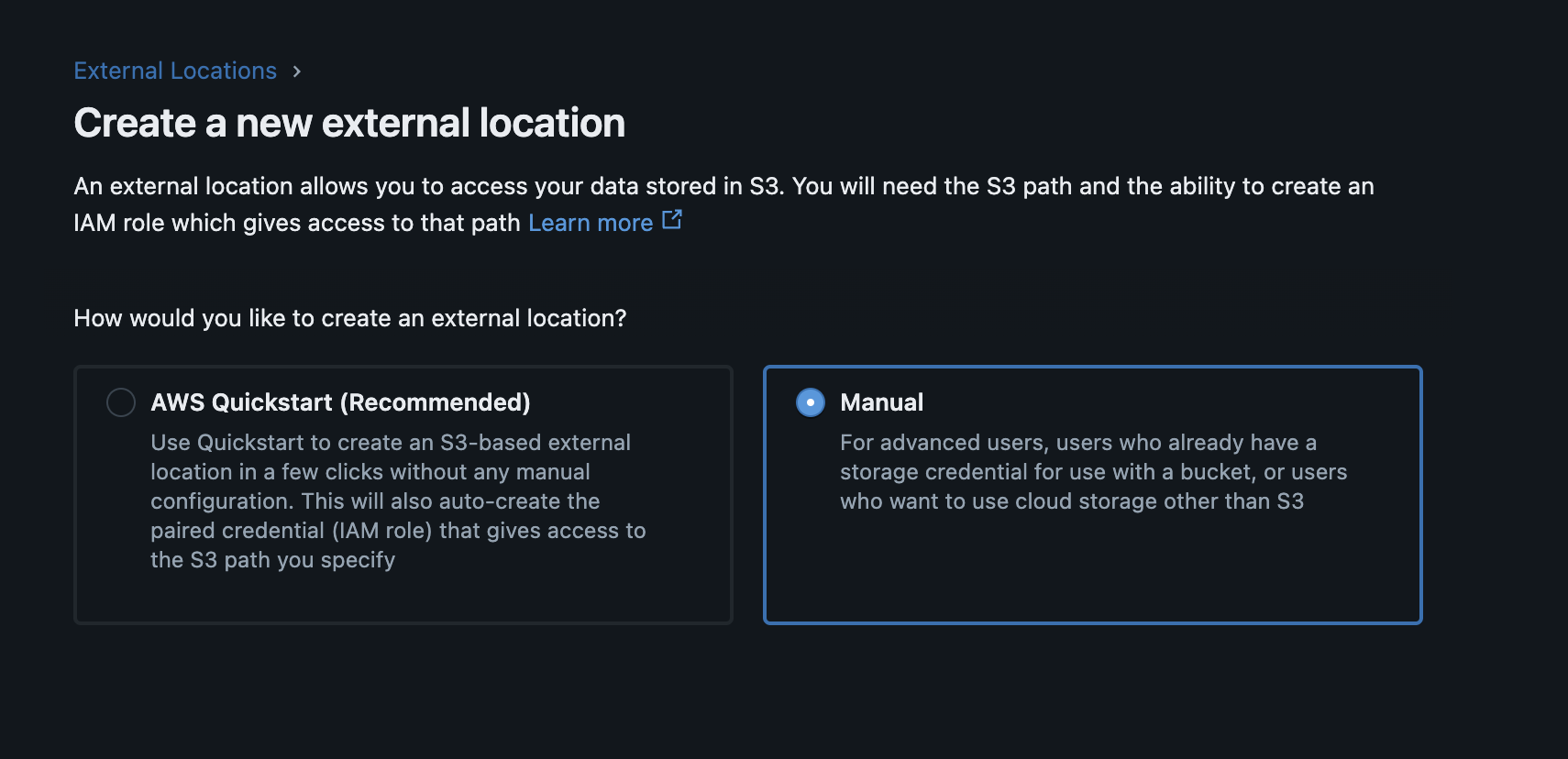 Configure a Databricks External Location to connect your warehouse to the S3 bucket created by the Agent deployment.