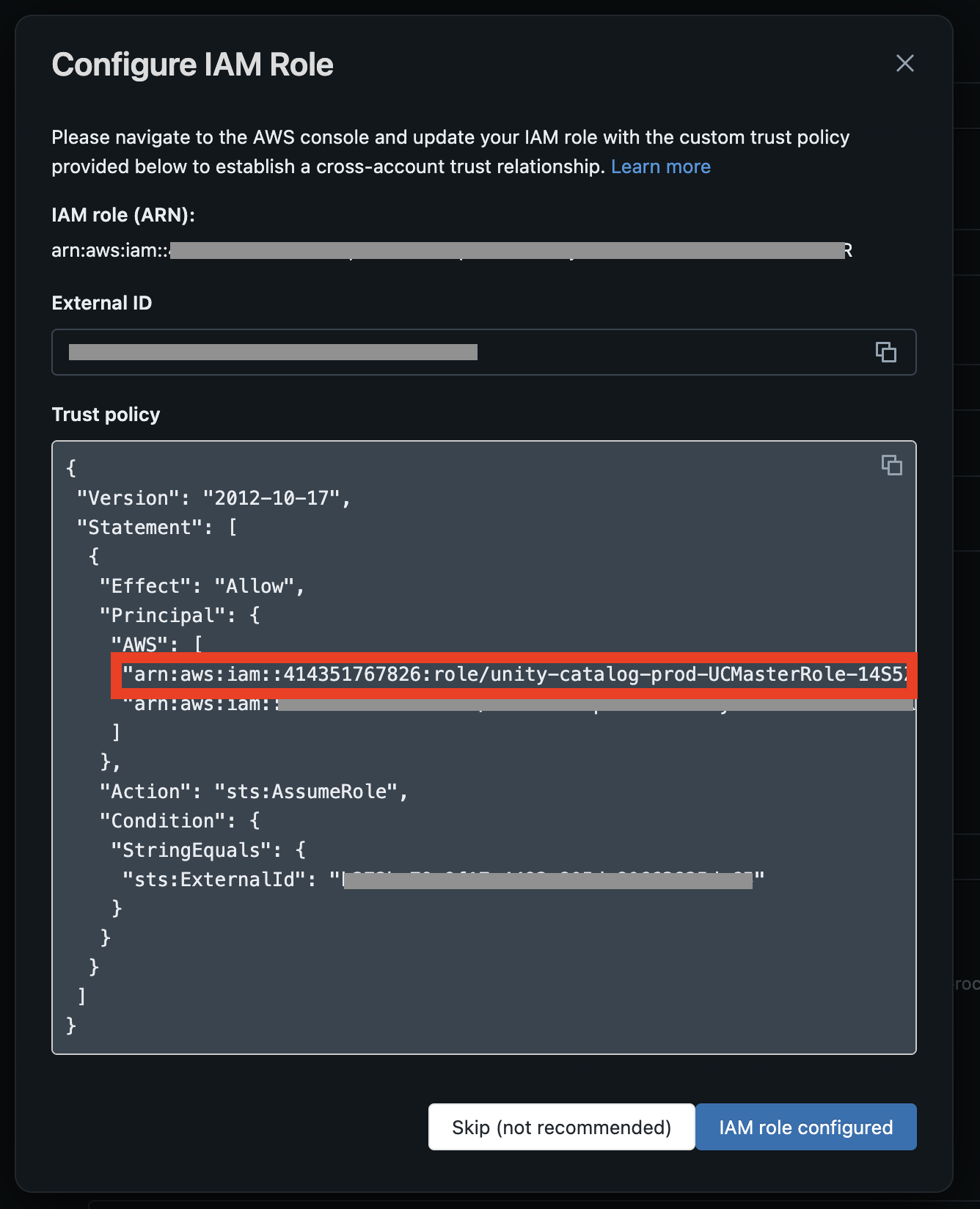 - Copy the following values from the "Configure IAM Role" page for the next step