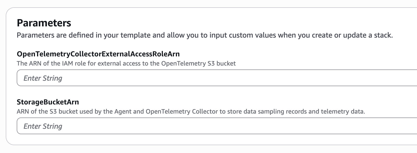 Set the OpenTelemetryCollectorExternalAccessRoleArn to the value from the output of the MC Agent stack deployed previously. Set the StorageBucketArn to the S3 bucket used to store the OpenTelemetry data.