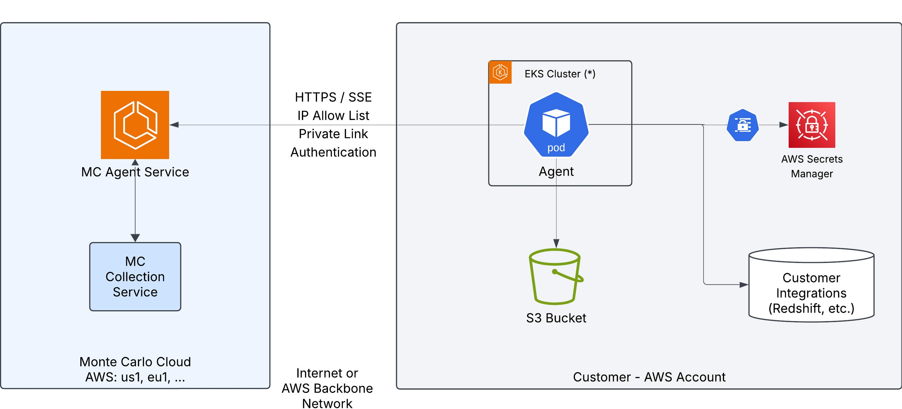 Traffic to the Monte Carlo platform can optionally be routed over AWS PrivateLink instead of the public internet.