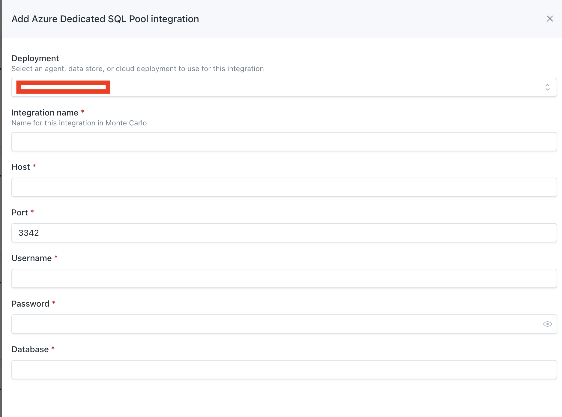Deployment:[Optional] If you have multiple deployments already in your Monte Carlo account, choose the deployment you want to use for this integration. If you do not have multiple deployments, this field will not be shown.Integration name: The user-friendly name for this integration.Host: The hostname of the Dedicated SQL pool.Port: The port of the Dedicated SQL pool, typically 3342.Username: The username created in Step 2.Password: The password created in Step 1.Database: The database name the user was created in that contains the external tables.