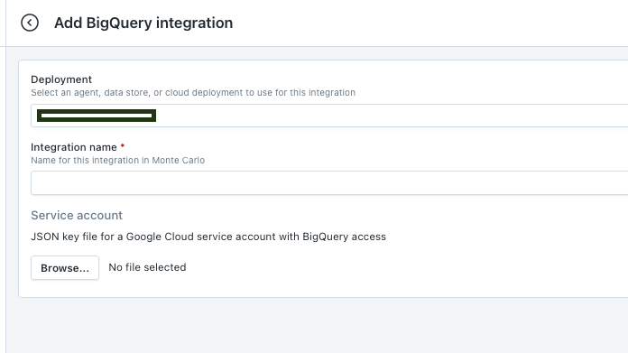 Deployment: [Optional] If you have multiple deployments already in your Monte Carlo account, choose the deployment you want to use for this integration. If you do not have multiple deployments, this field will not be shown.Integration name: The user-friendly name for this integration.Service account: The JSON key you created above.