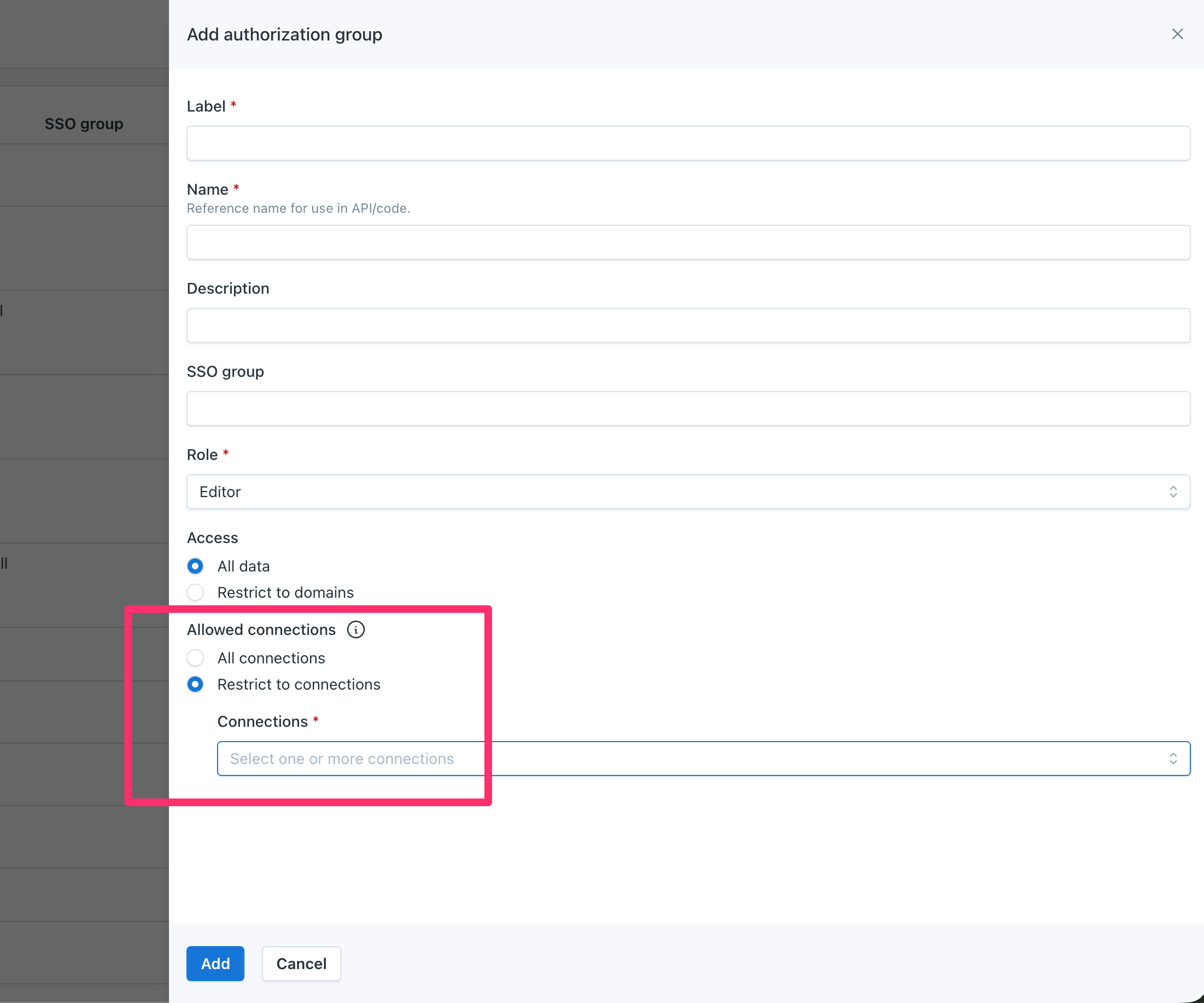 Administrators can define which connections are available to users who are part of an Authorization Group