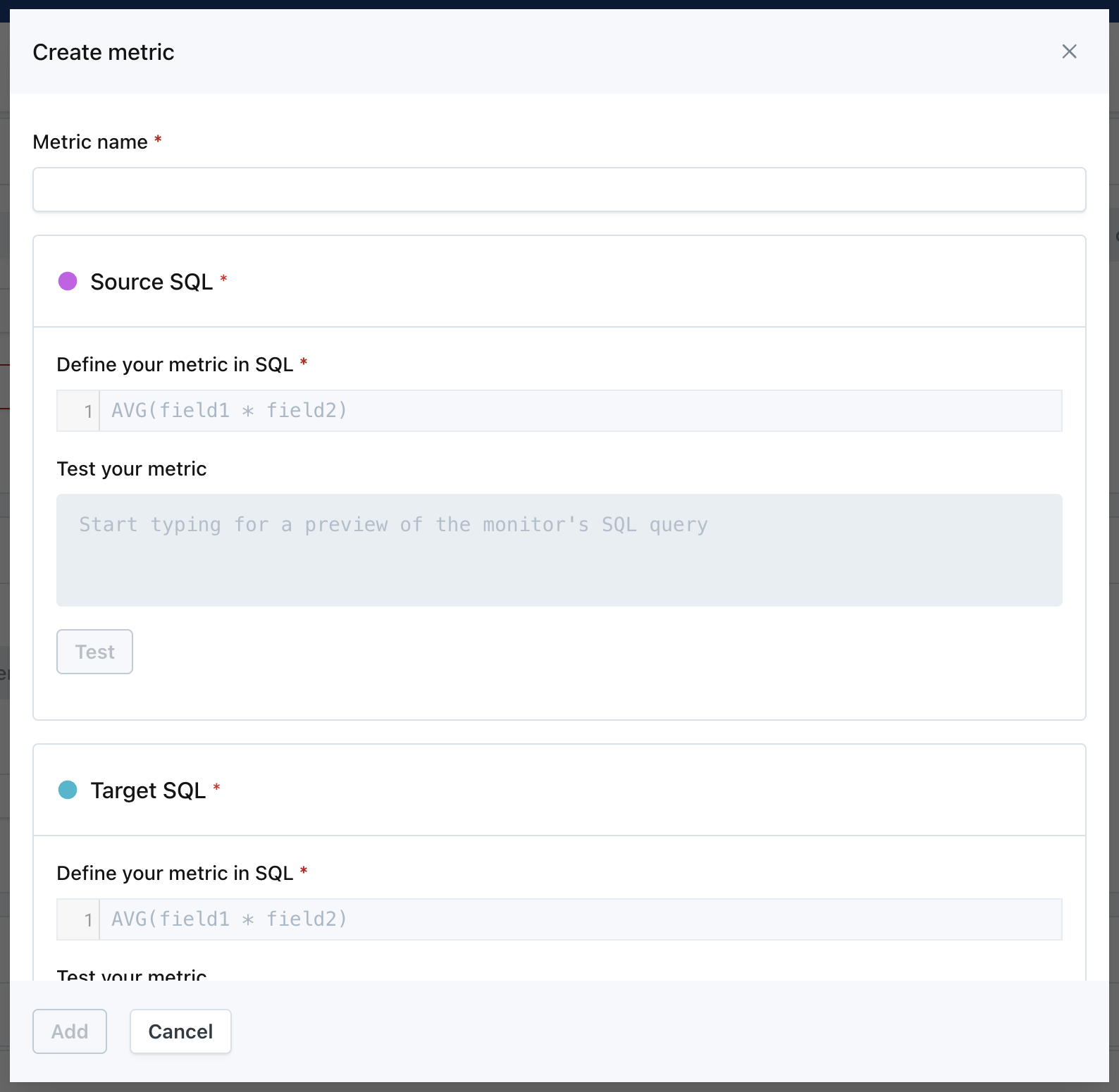In a Comparison Monitor, provide a metric name and a SQL expression for source and target, then test each metric to confirm they work.