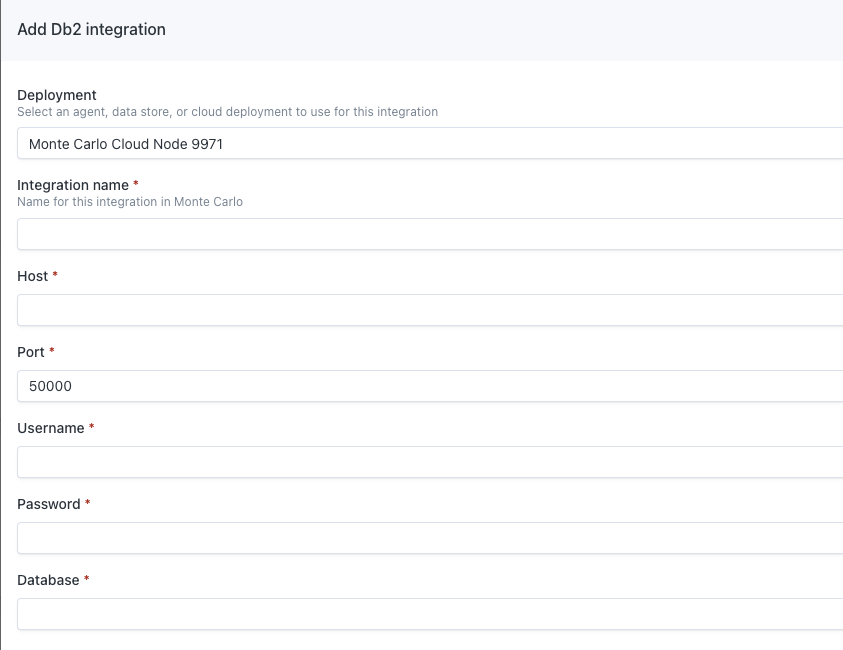 Deployment: [Optional] If you have multiple deployments already in your Monte Carlo account, choose the deployment you want to use for this integration. If you do not have multiple deployments, this field will not be shown.Integration name: The user-friendly name for this integration.Host: The host of the Db2 database, (e.g.db2-database.xxxxxxx.us-east-1.rds.amazonaws.com)Port: The SQL port of the Db2 database, typically50000.Username: The username of the service account you created in Step 1.Password: The password of the service account you created in Step 1.Database: The Db2 database name that Monte Carlo will monitor.