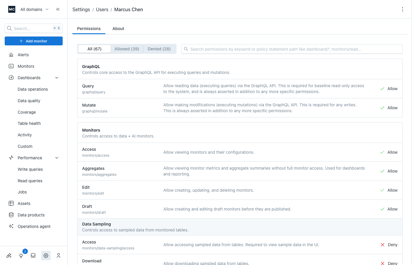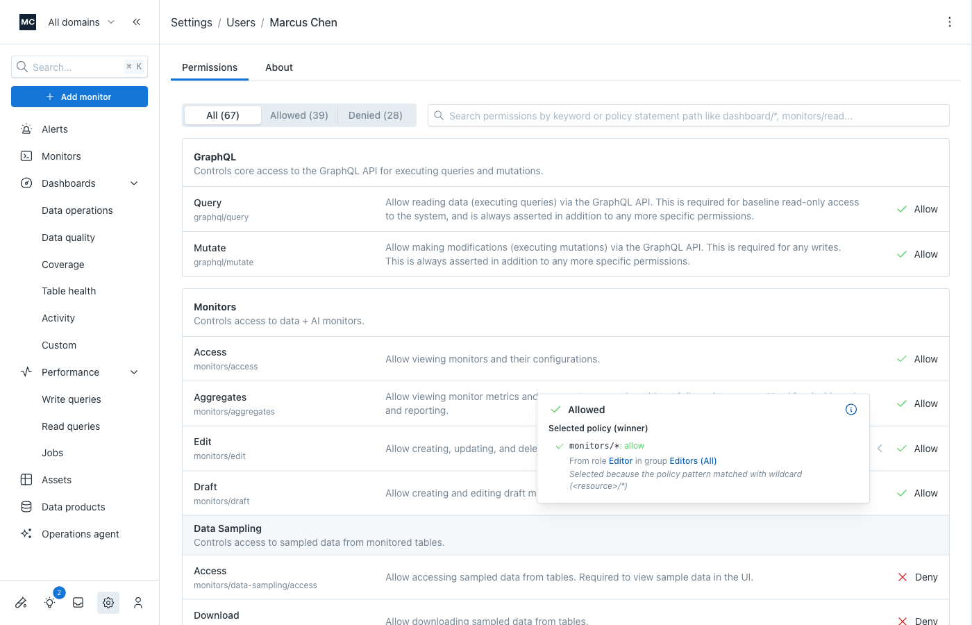 Monte Carlo resolves a user's effective permissions by combining all of their authorization group memberships. Each group assigns one or more roles, and each role contains policy statements that allow or deny specific permissions.