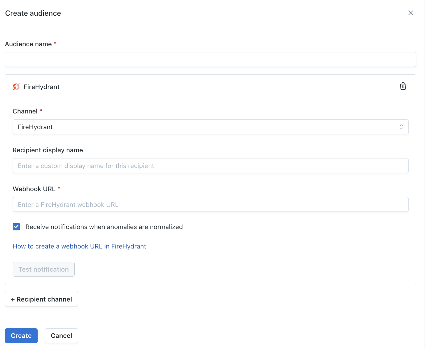 Finally, you can send a Test notification to verify it's received in FireHydrant before saving; or you can add the recipient channel and save the audience directly.