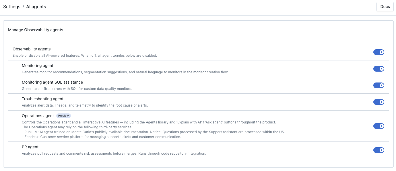 pr_agentflag to be enabled on your account. This flag is available in Monte Carlo Settings > AI Agents.If the GitHub integration is installed but