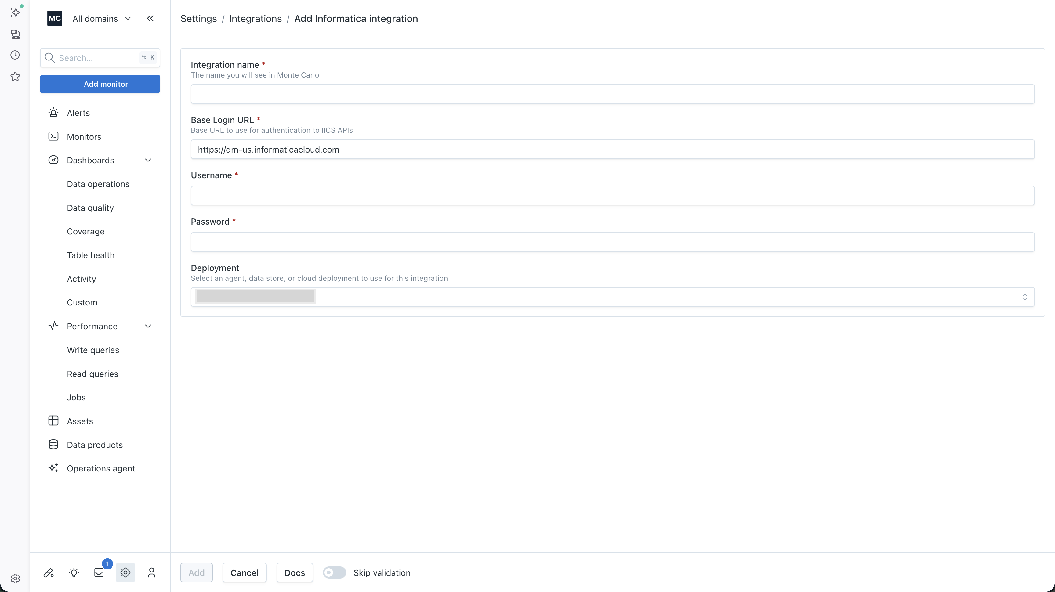 Fill out the form fields required. The Base Login URL will depend on the Informatica POD (point of deployment) for your organization. See Informatica documentation for more information. A username and a password are required to authenticate with Informatica’s REST APIs. Also select the agent/data collector you'd like to use for the connection, if you have more than one.