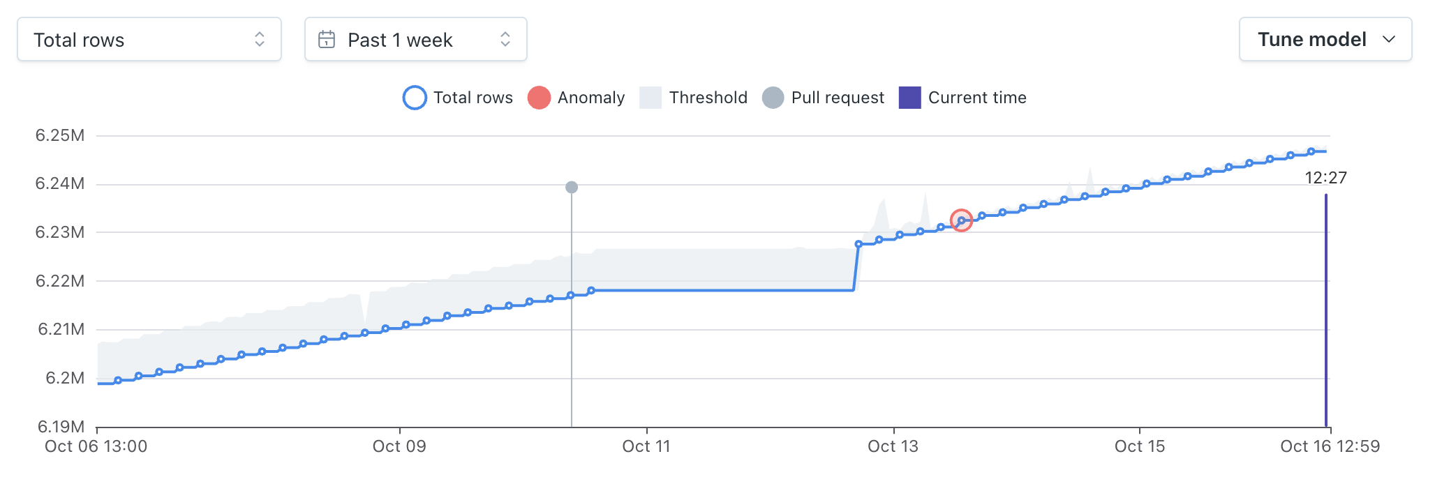 In this case, the deviation is a halt in Volume changes. In other words, the table has not changed in size as expected based on historical trends.