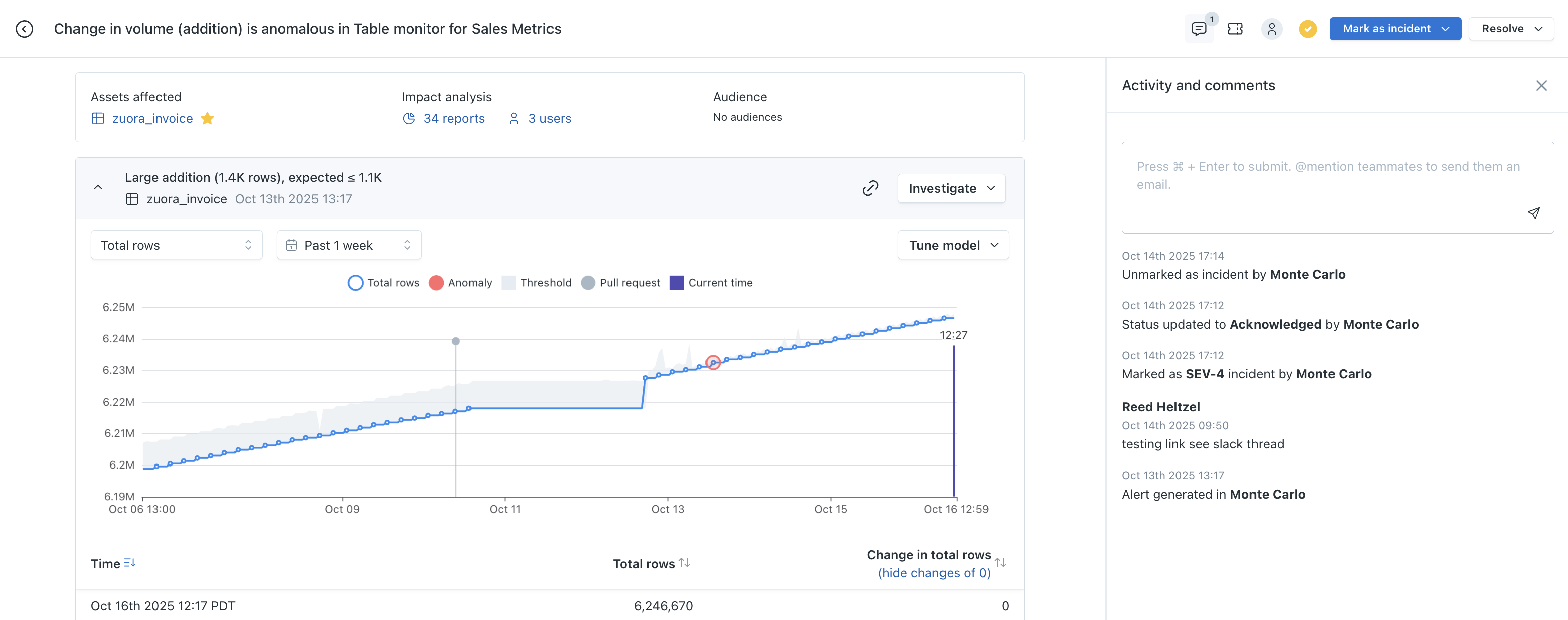 In this example, the alert originated from an automated Table monitor which tracks patterns in Volume change -