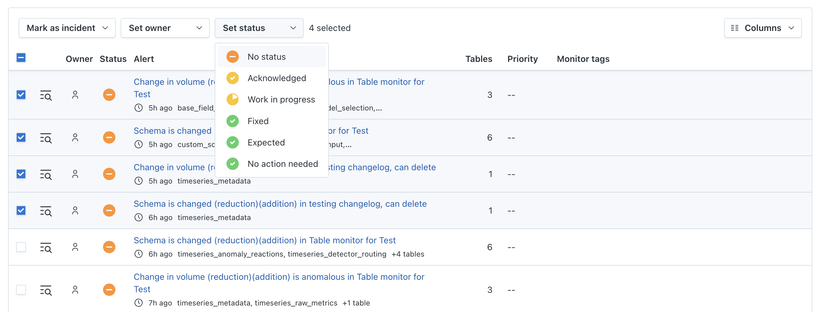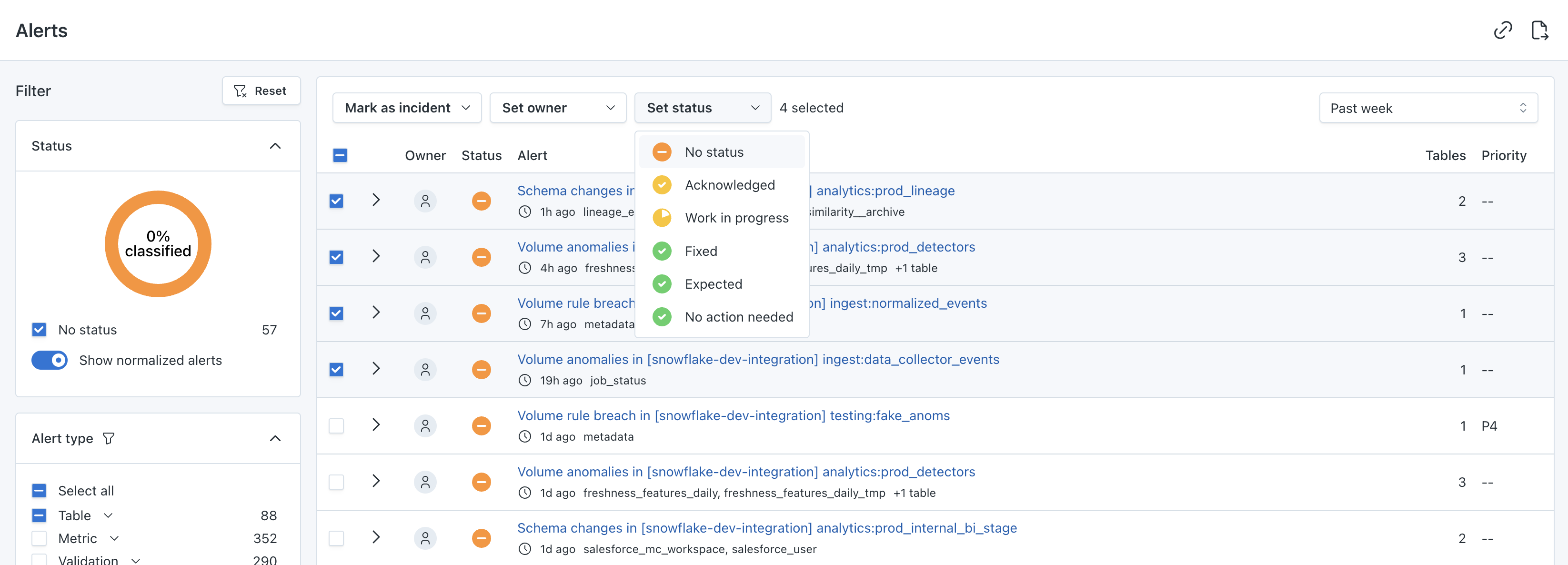 Select multiple alerts by checking the box at the start of each row. This allows you to assign owner, severity, and status to multiple alerts at the same time.