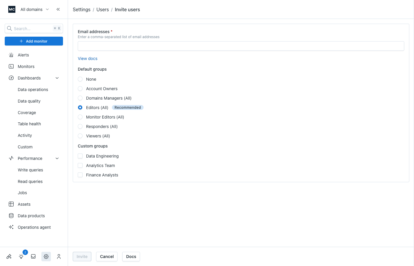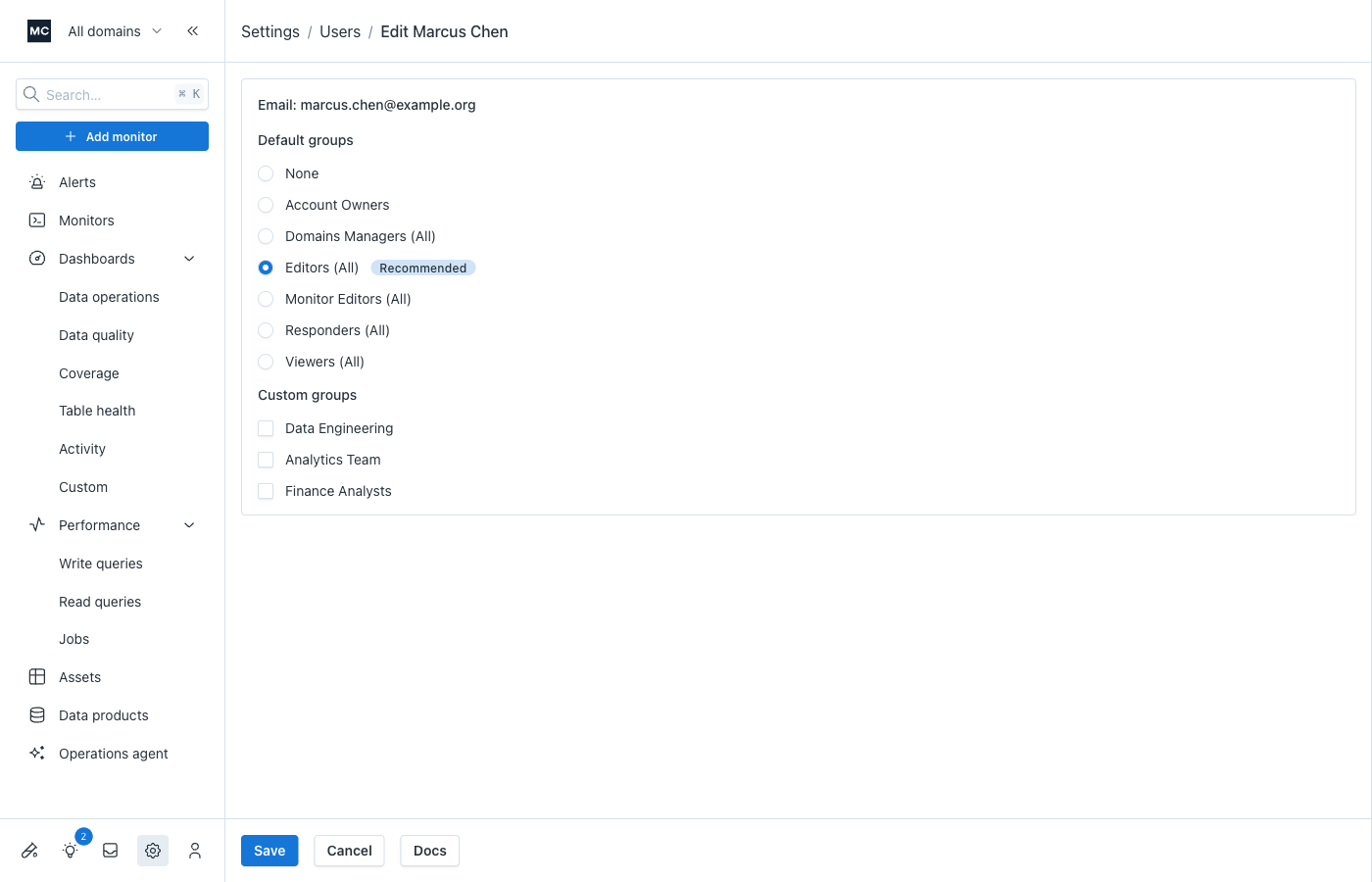 Users in Monte Carlo are granted permissions through their authorization group memberships. Each group has one or more roles that define what actions are allowed or denied.