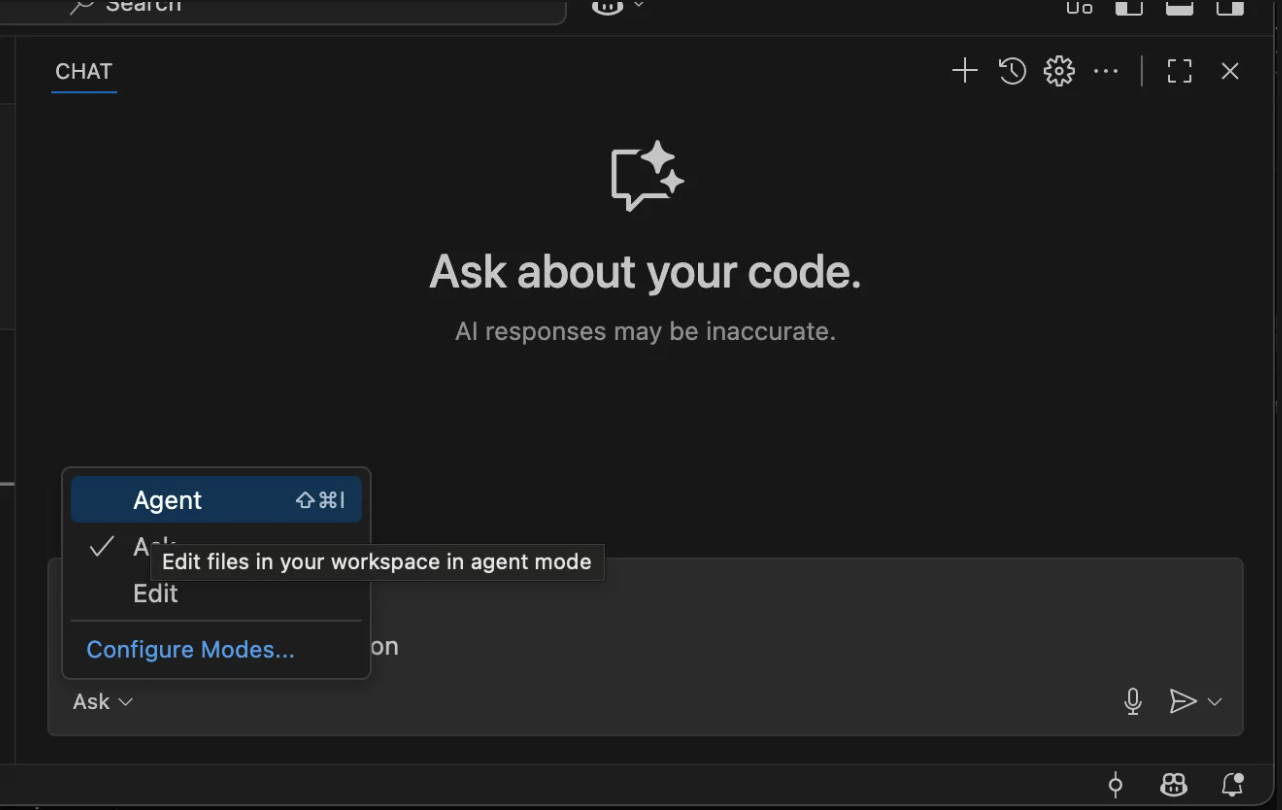 - Open the Chat screen and make sure the βAgentβ mode is selected.
