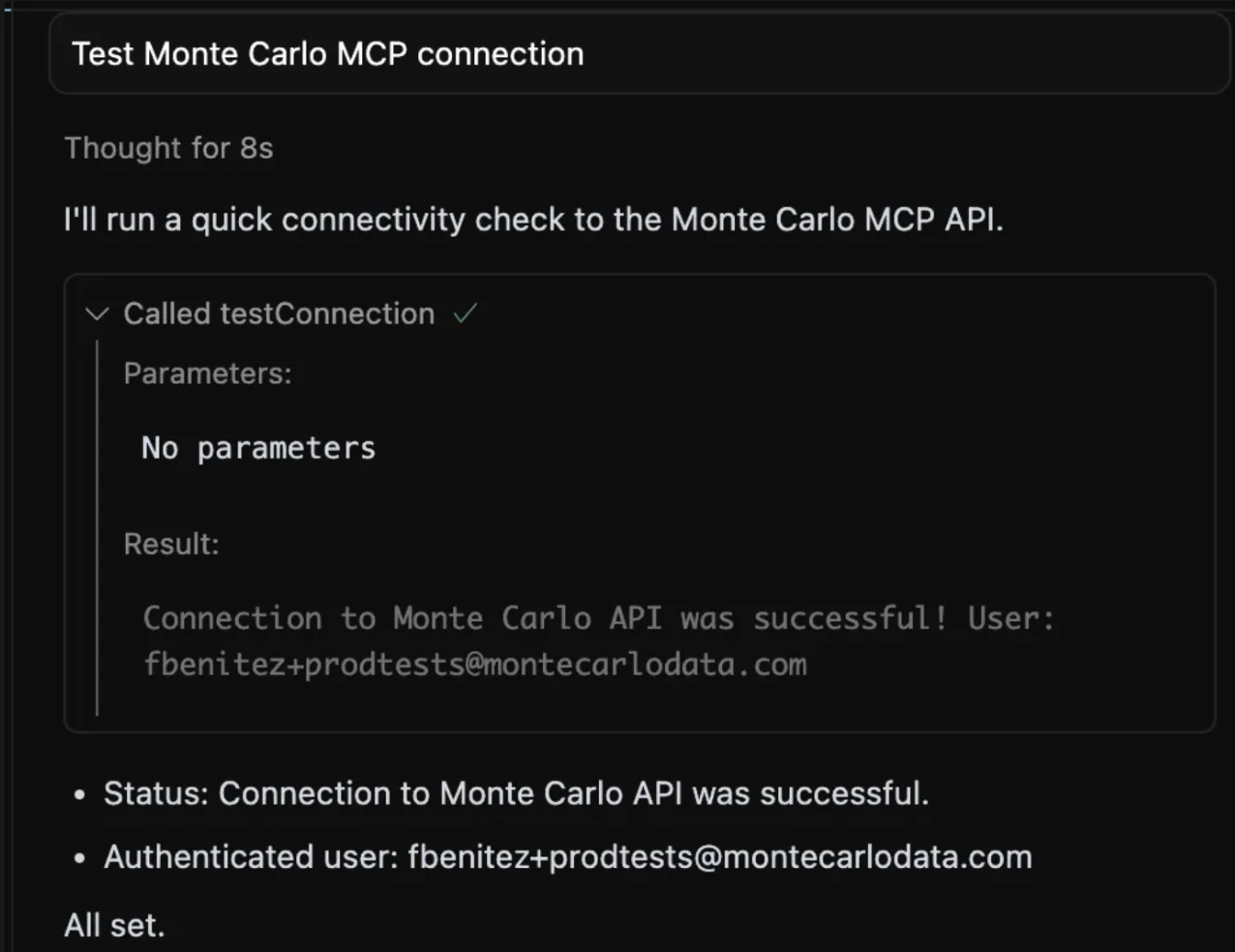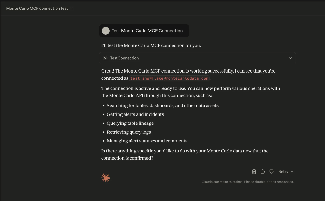 Test Monte Carlo MCP connection. You should see it call thetestConnectiontool (in some versions it may appear astest_connection).