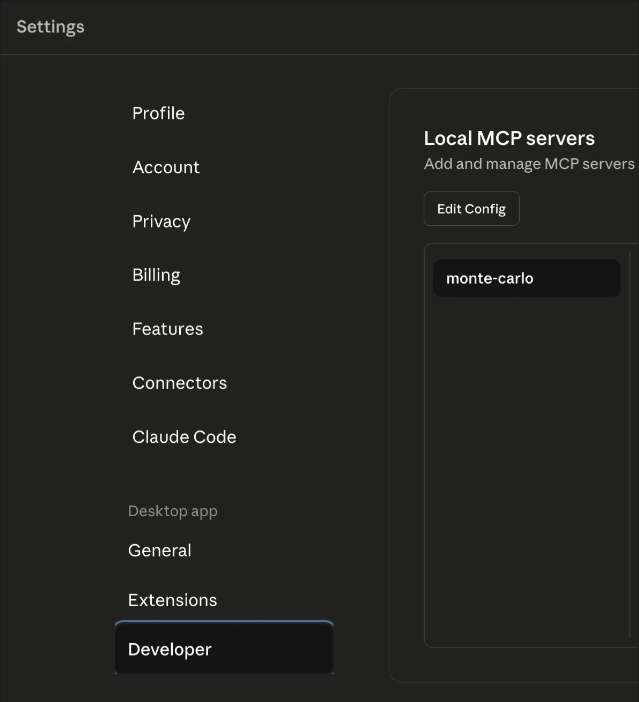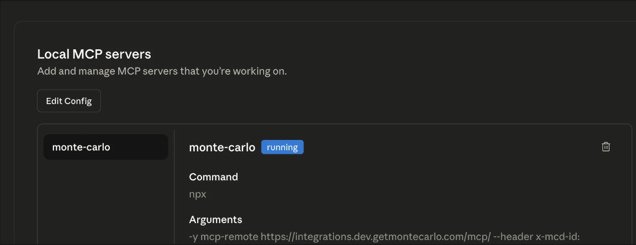 claude_desktop_config.jsonand close Claude. Open it again and return to Settings β Developer. You should see a monte-carlo MCP Server in status Running.
