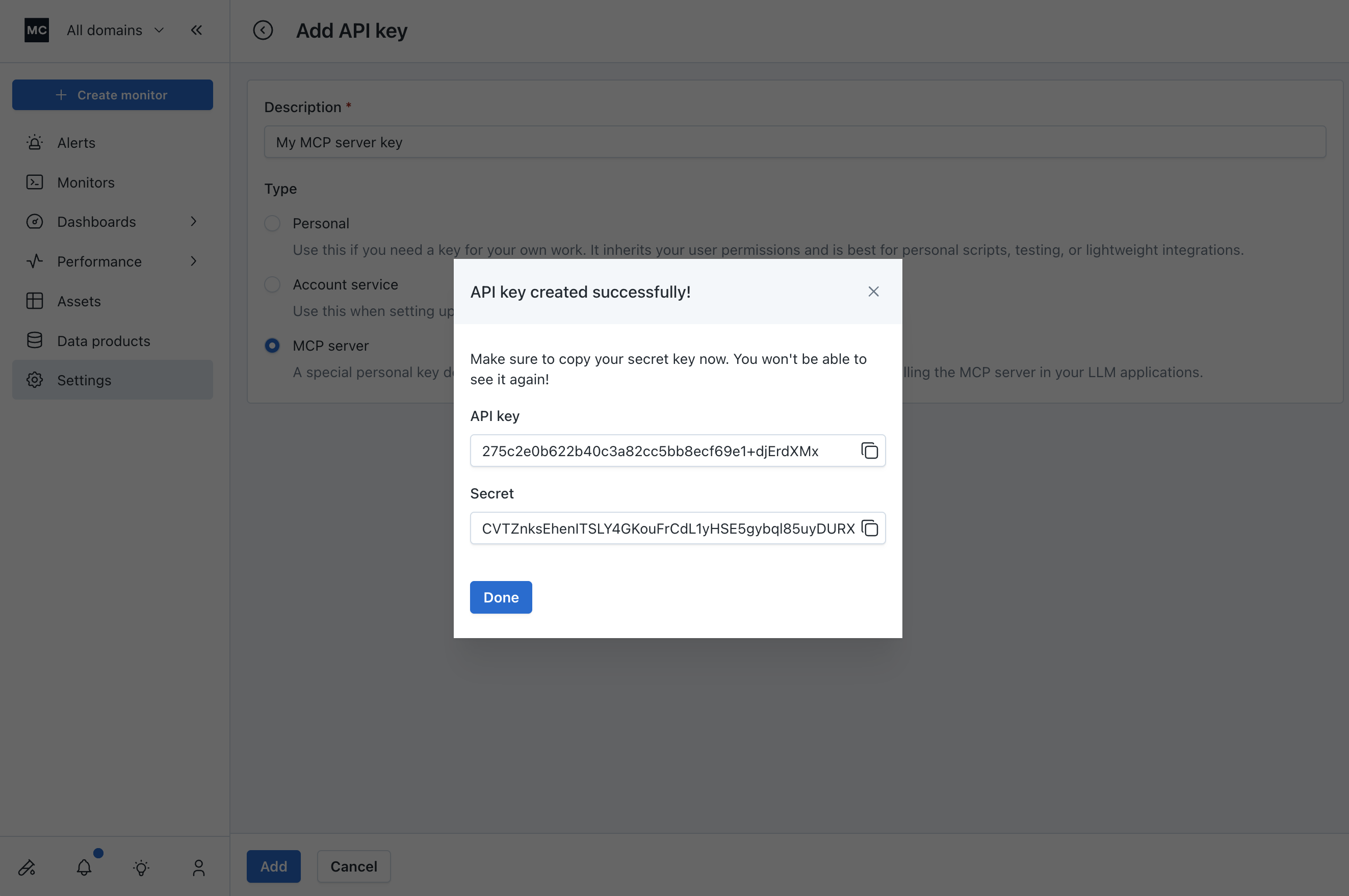 Select "MCP server" as the API key type, add a description to the key, then hit "Add".