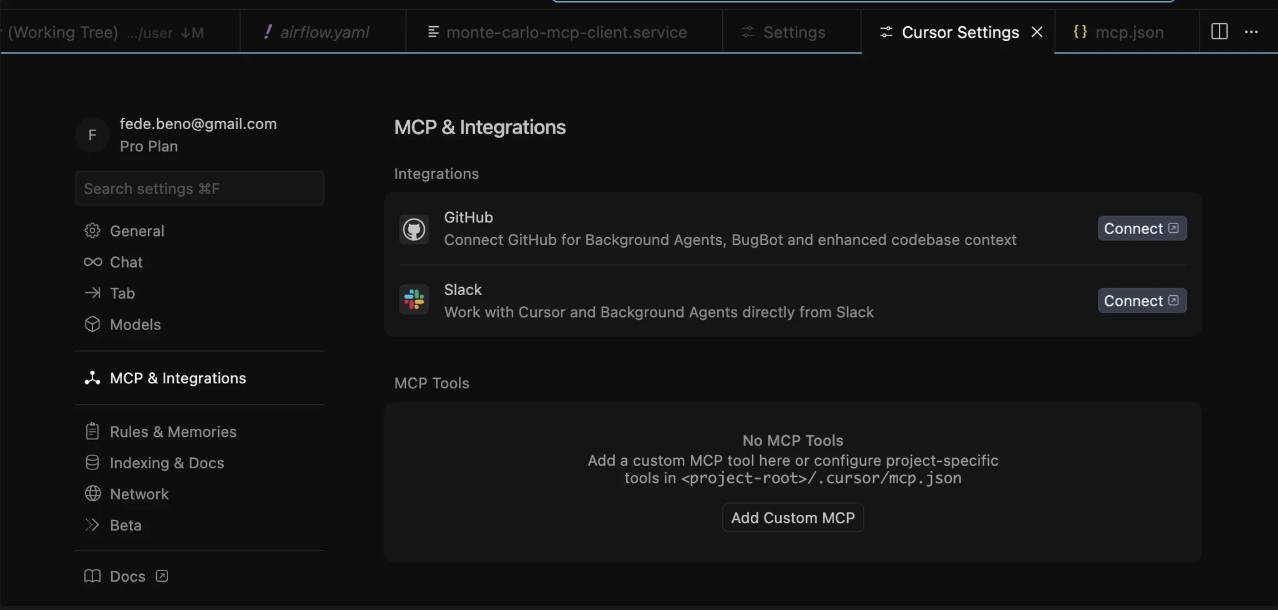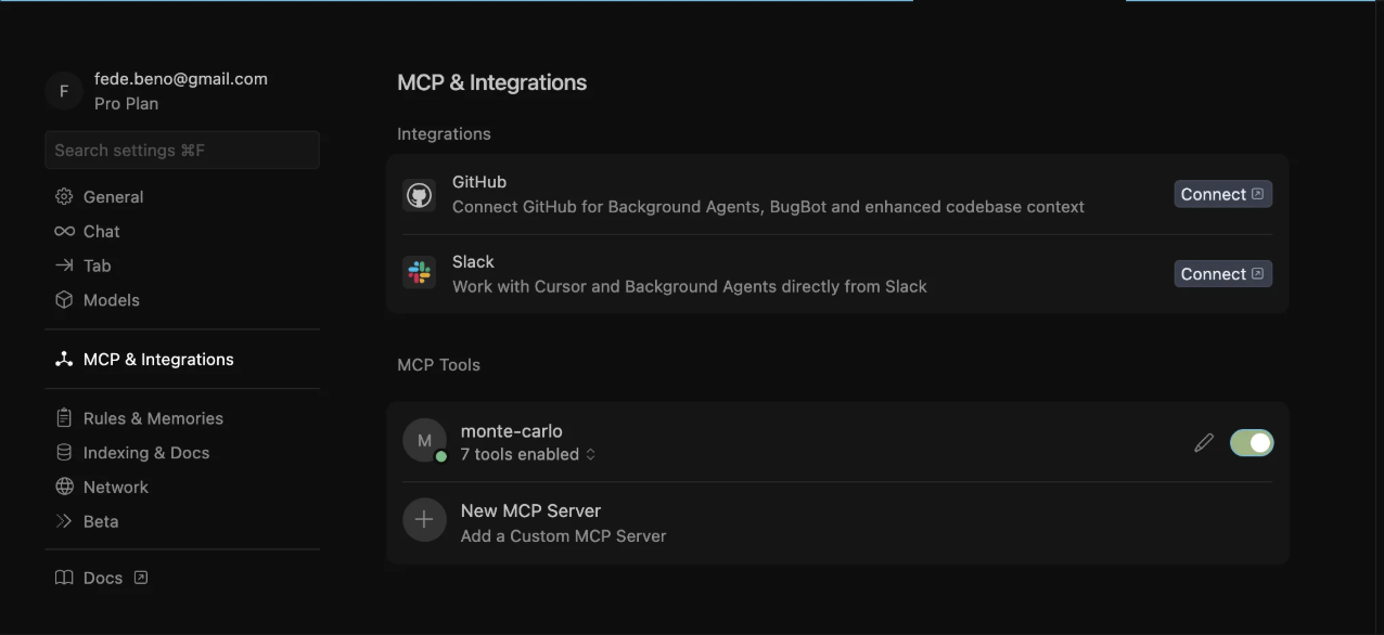 mcp.jsonand return to Settings β MCP & Integrations. You should see a monte-carlo toggle.
