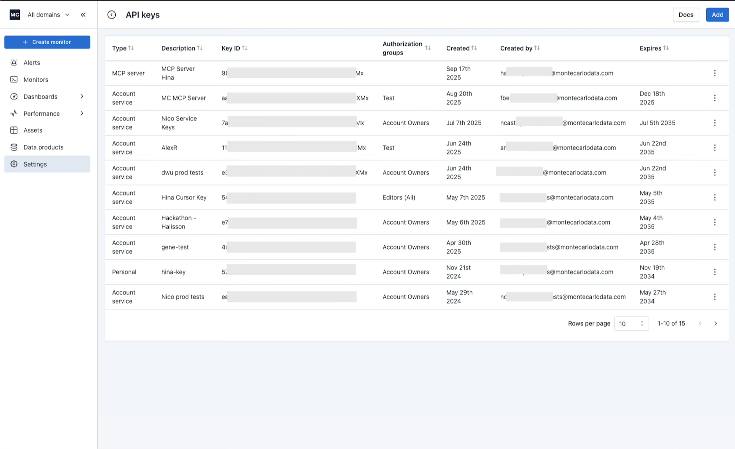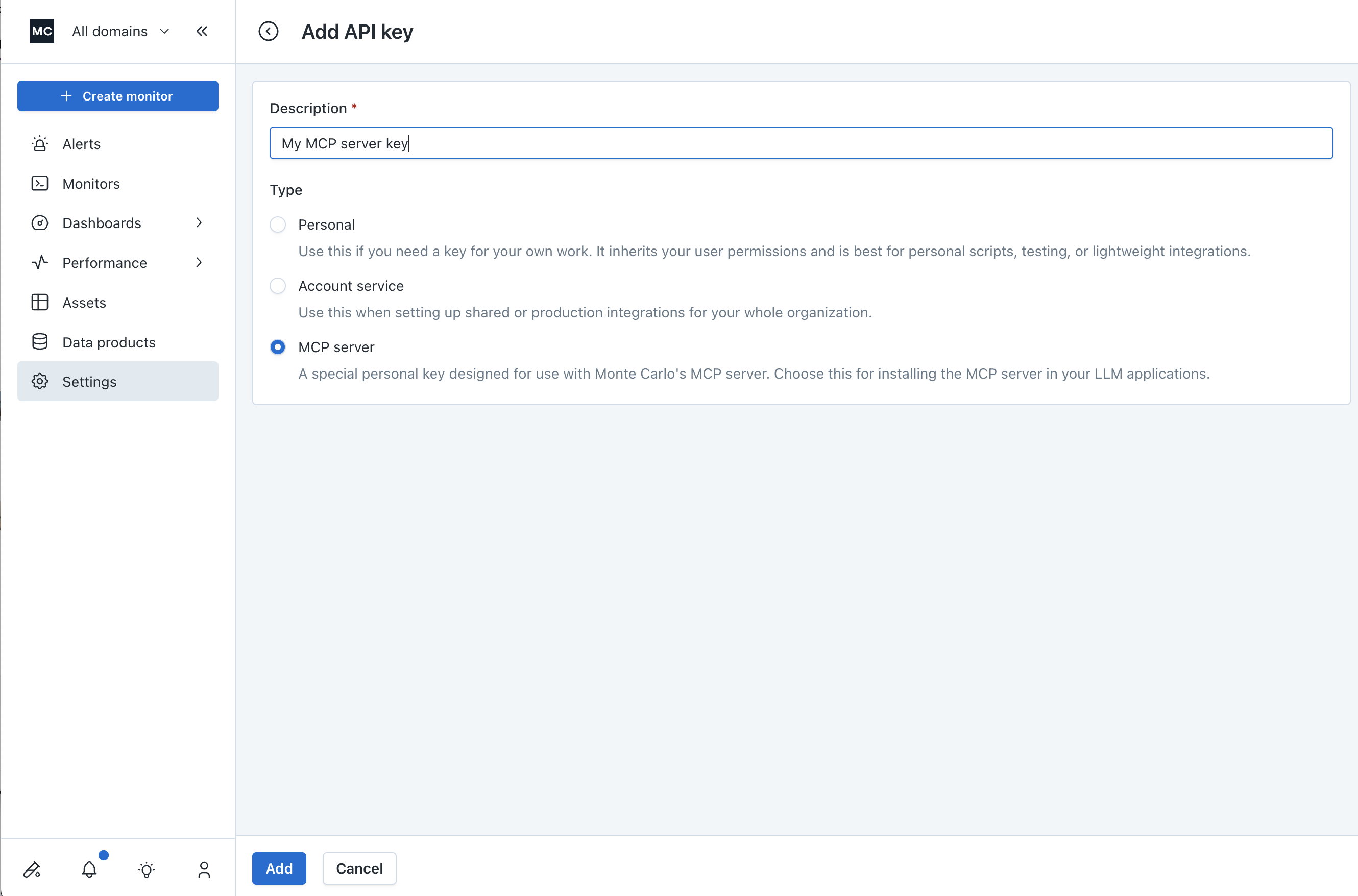 Go to Settings -> API Keys in the Monte Carlo UI, click on the blue "Add" button to start creating a MCP server key.