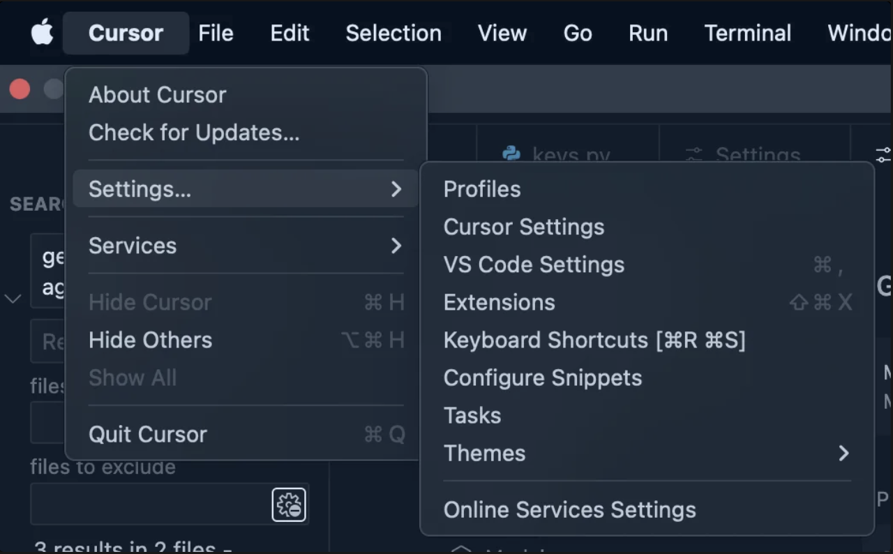 - Open Cursor β Settings.
