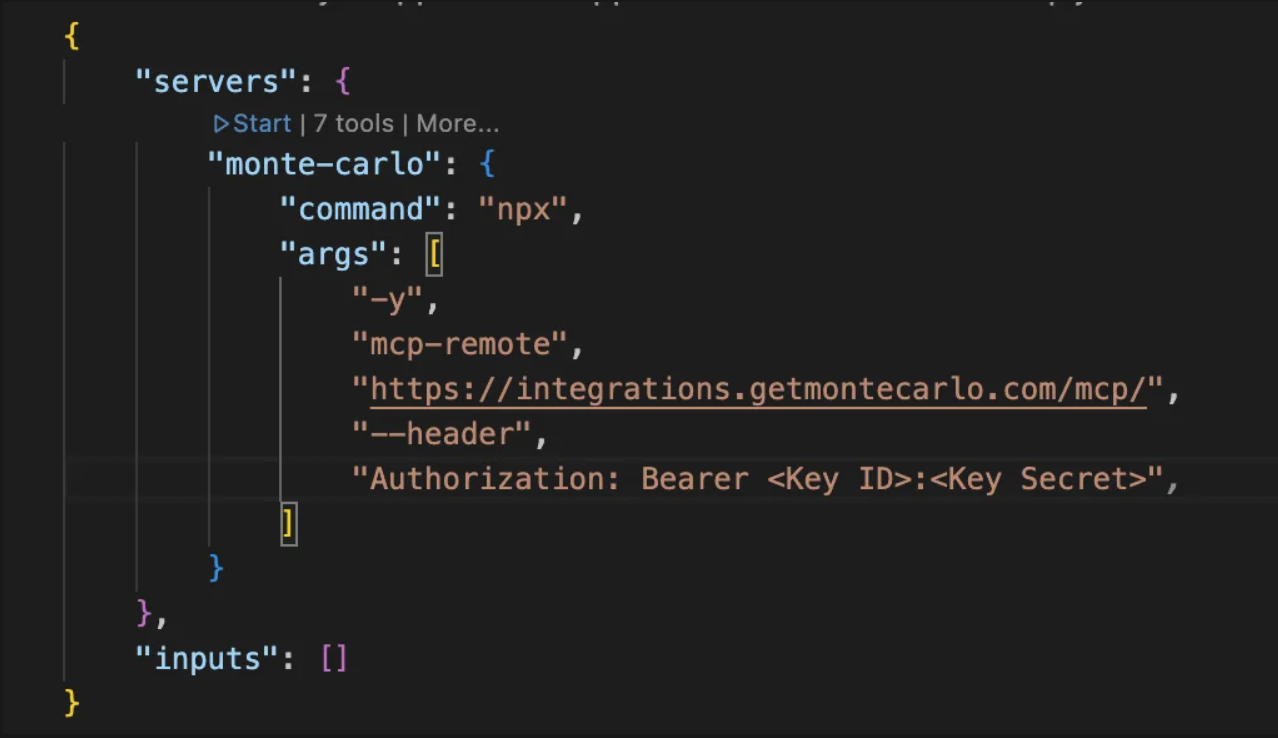 Once you have your Key id and Key secret, add the Monte Carlo MCP Server to your IDE.