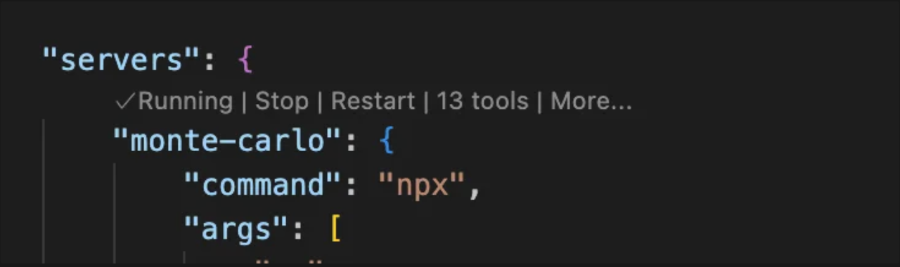 mcp.jsonand click on the βStartβ button over the βmonte-carloβ MCP Server configuration
