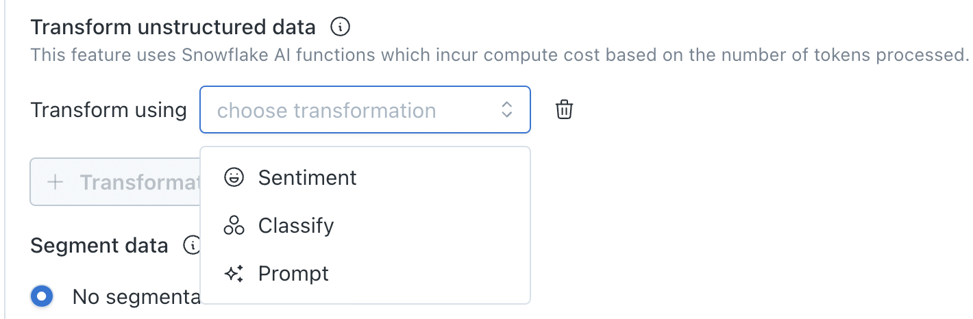 Transform unstructured data: available for Snowflake, Databricks and BigQuery using native AI functions in each platform. You can choose to apply a transformation to eligible text fields—such as extracting sentiment, classifying by category, or asking a custom prompt—and give the output field a name (e.g., review_sentiment or ticket_urgency). Once transformed, the result can be used like any other column. Read more about monitoring unstructured data.