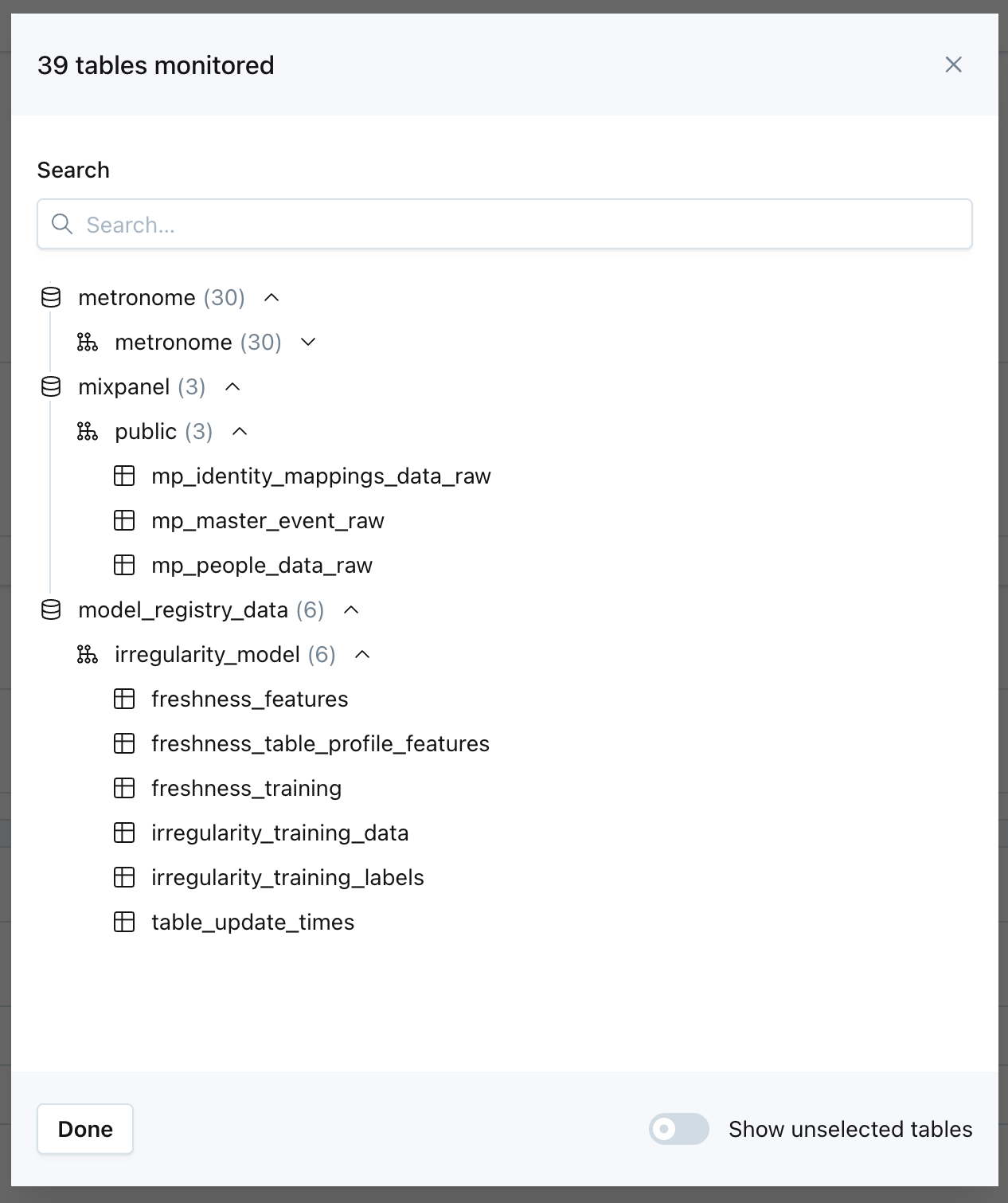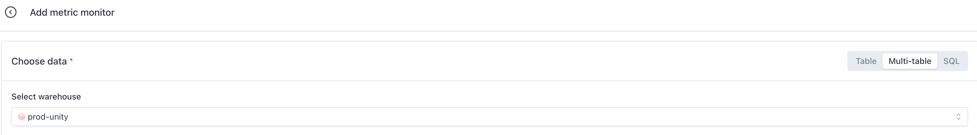 Multi-table metric monitors apply the same metric logic across many tables at once, making it easy to enforce consistent data quality standards at scale. They're dynamic—automatically including new tables that match your criteria as they're created.