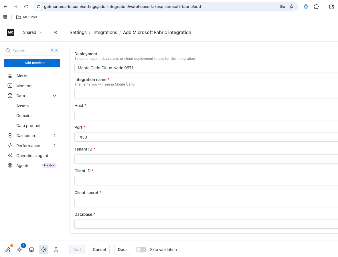 Step 3: Add Microsoft Fabric Integration in Monte Carlo