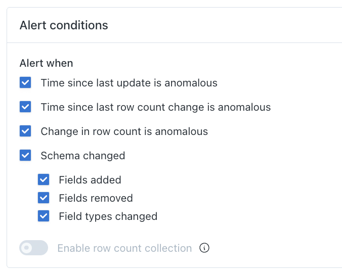 Whenever possible, Table Monitors use metadata to minimize the workload on your warehouse. However, some asset types (such as Views) and certain integrations don't expose row count metadata. For these assets, you can enable row count collection, which runs a COUNT(*) query to collect row counts directly and enable Volume and Freshness (Time since last row count change) monitoring. Some platforms provide volume tracking through byte count metadata — on these platforms, row count collection is an optional addition to add row-level granularity.