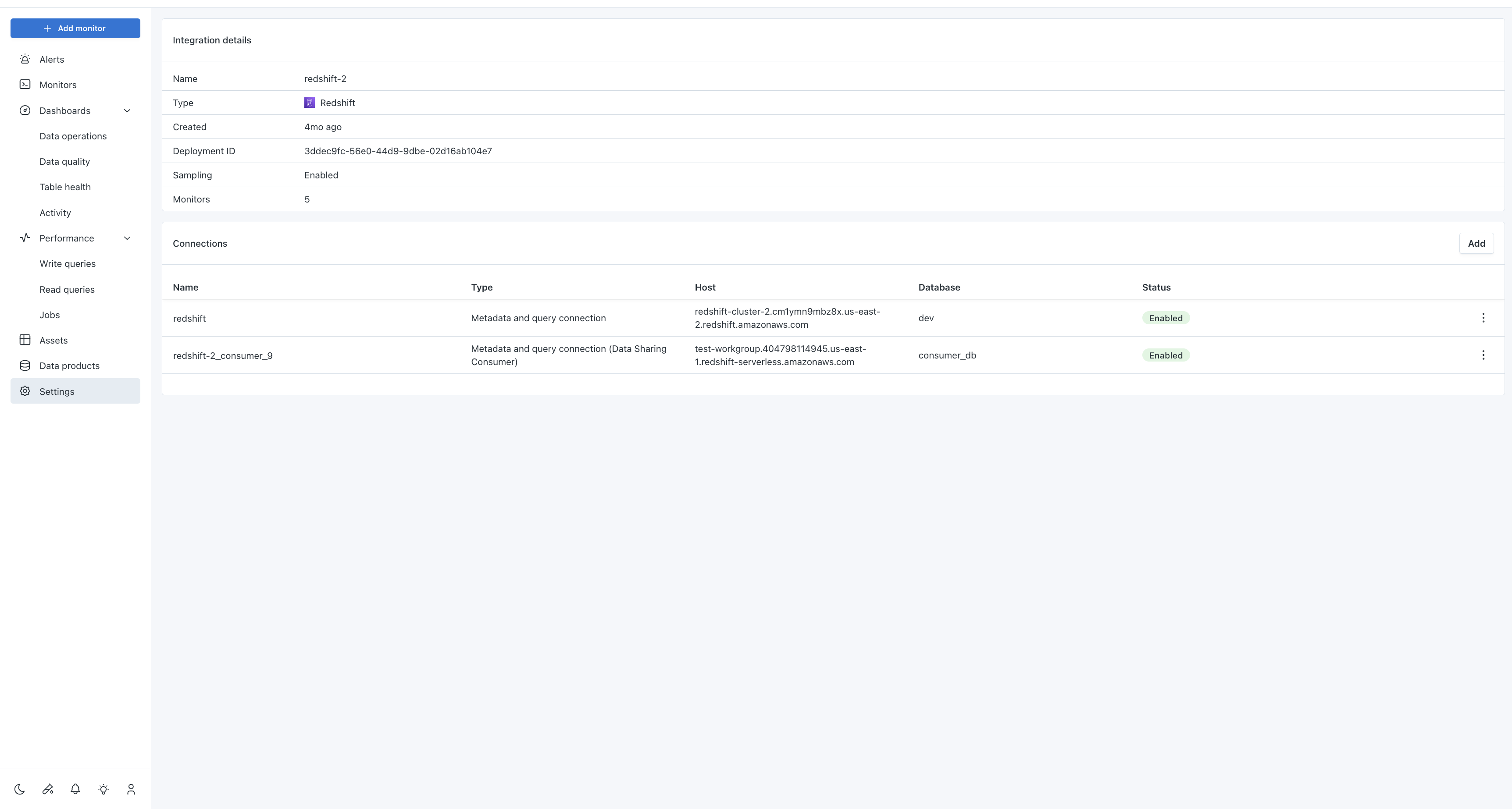 Since producer and consumer databases are separate (and generally in separate accounts), Monte Carlo requires separate connections for each producer and consumer database. In the UI, these are displayed as separate connections within an integration, but they are logically connected as producer and consumer.