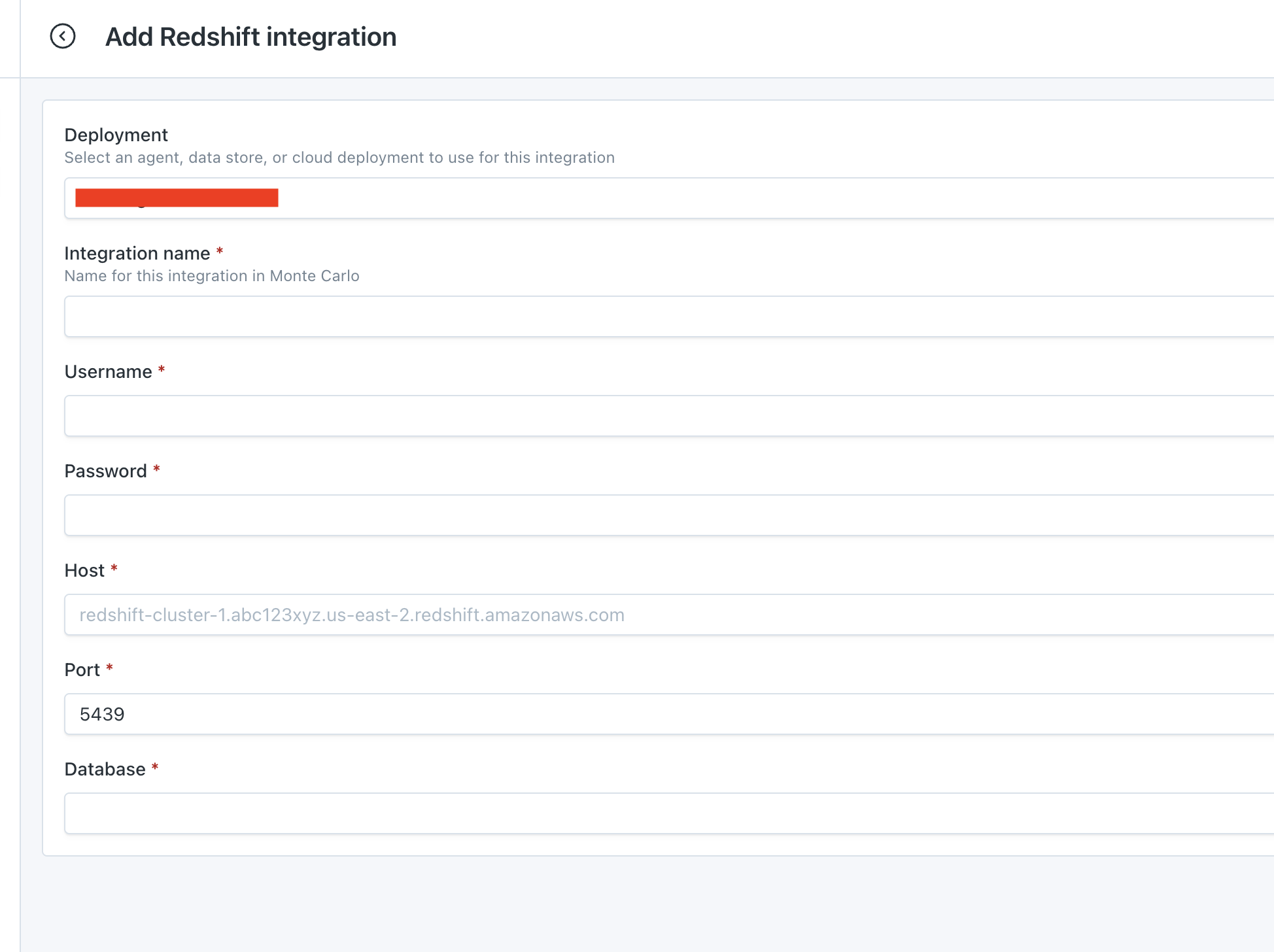 Deployment: [Optional] If you have multiple deployments already in your Monte Carlo account, choose the deployment you want to use for this integration. If you do not have multiple deployments, this field will not be shown.Integration name: The user-friendly name for this integration.Username: The username of the service user you created.Password: The password of the service user.Host: The hostname of your Redshift cluster or serverless instance.Port: The port of your Redshift cluster or serverless instance, typically 5439.Database: The database name your external schema and tables live in. E.g., created in Step 2.